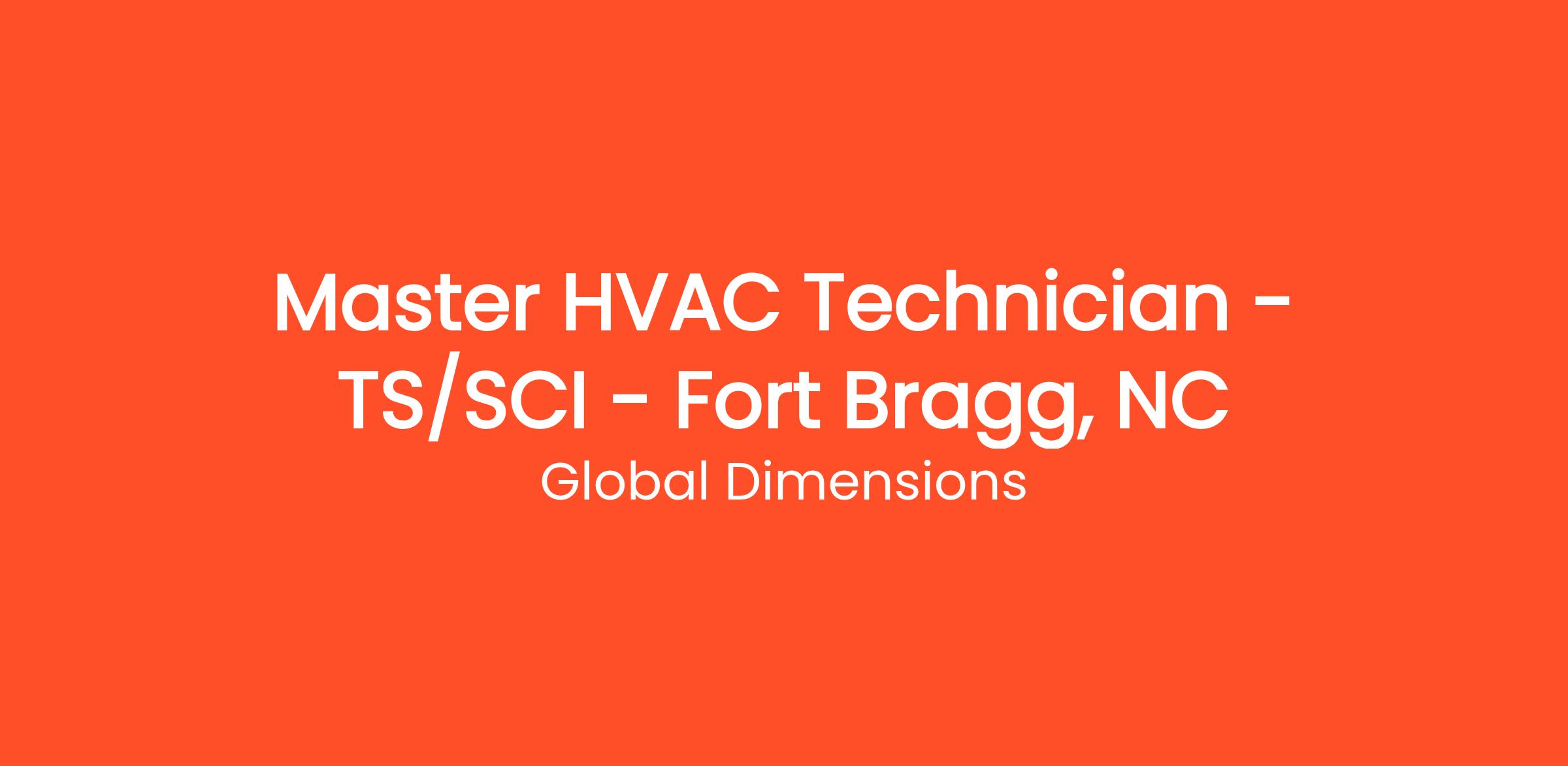 Global Dimensions is a HUBZone, service disabled, veteran-owned small business based in Fredericksburg, VA. We are a dynamic, expanding company with exciting opportunities in language/culture, training/education/instruction, IT, cyber security, and intelligence (analysts, CI, HUMINT, SIGINT, etc.). Global Dimensions is seeking Master HVAC Technicians for upcoming opportunities at Fort Bragg, in Fayetteville, NC.