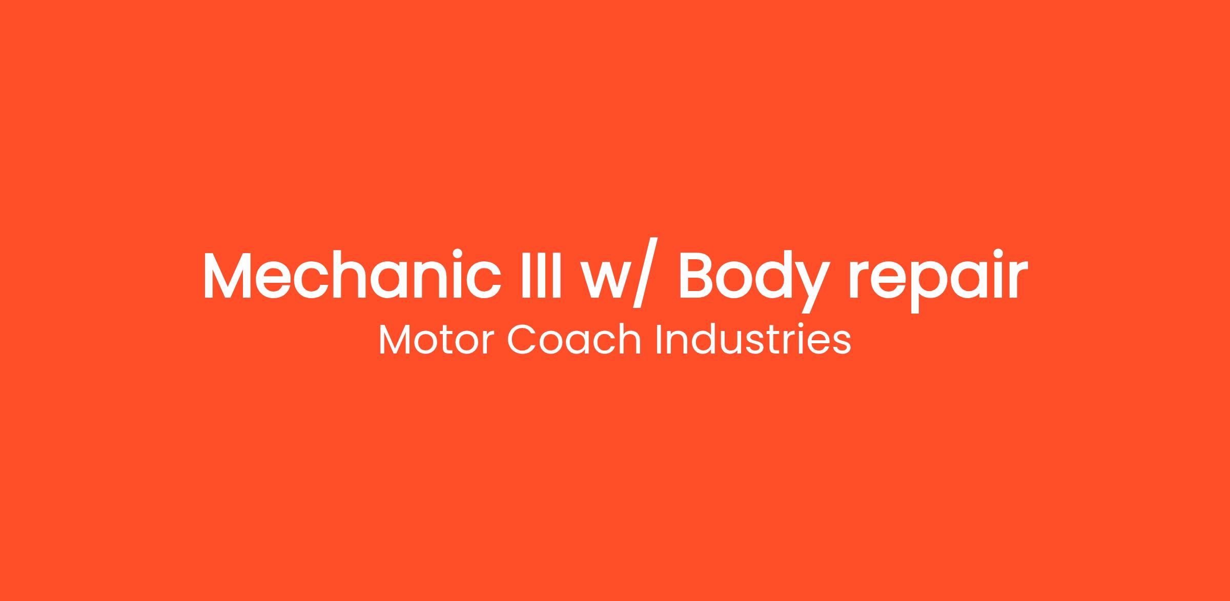 Reporting to the Shop Supervisor, the Mechanic III will perform the removal, repair, and replacement of a variety of motor coach components. Primary responsibility is Mechanic III, with additional duties including Body repair III level functions.