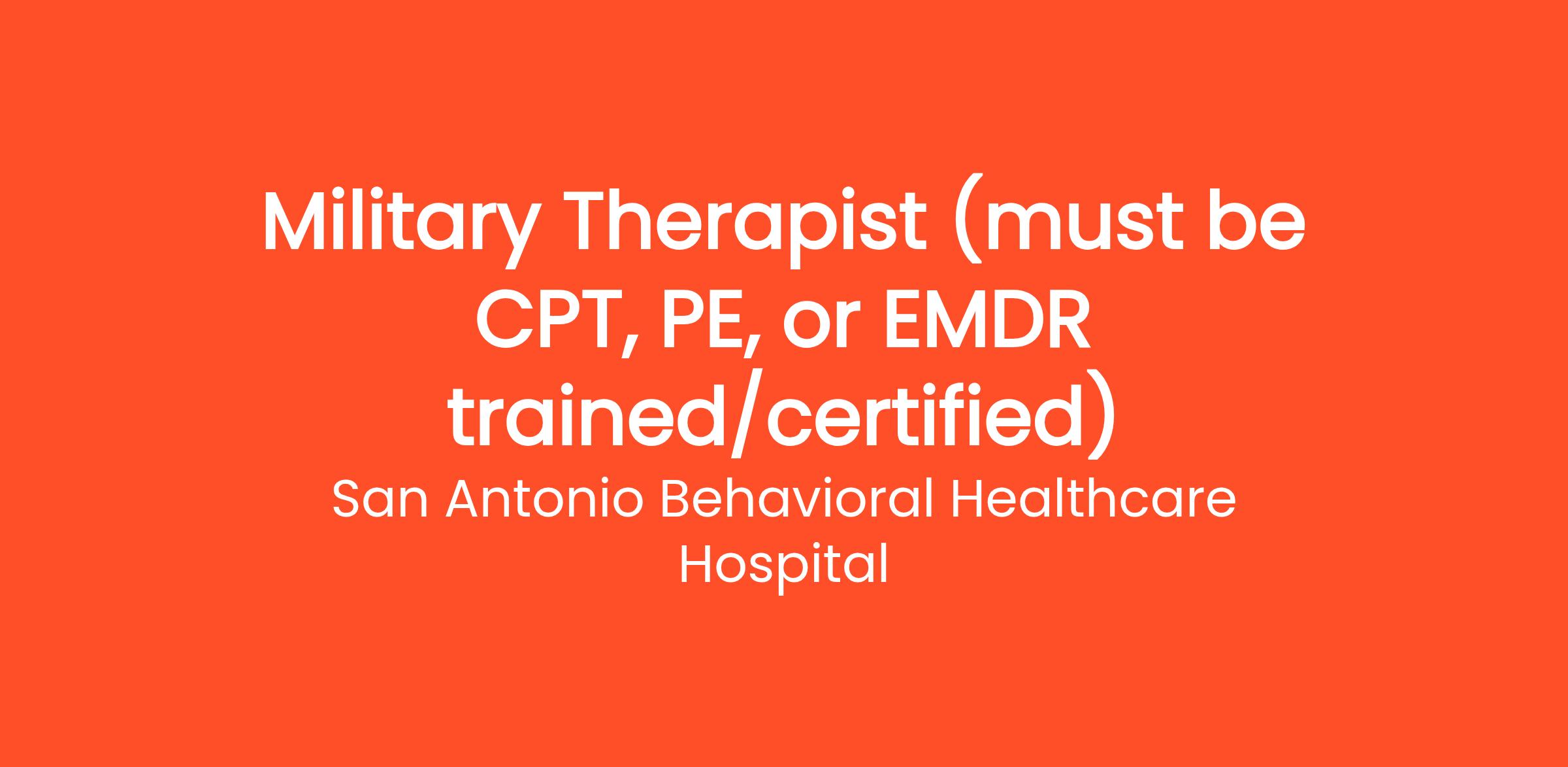 Education and/or Licensure – Master’s degree in social work or equivalent in a recognized mental health field. Texas Licensed LCSW, LPC, LMFT, required. Must be CPT, PE, or EMDR trained/certified.