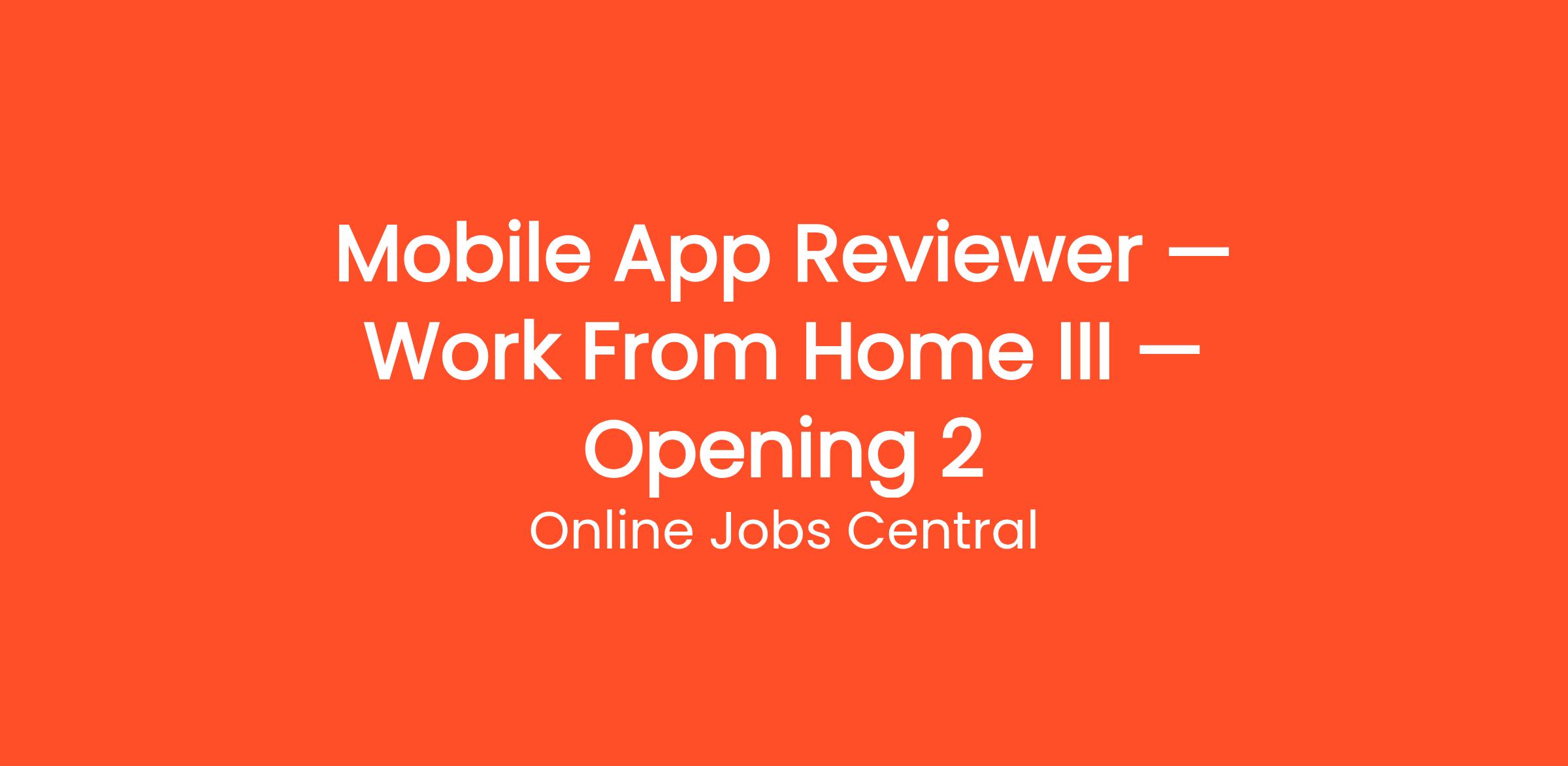 Thousands of people are already working from home as a Mobile App Reviewer — Work From Home III — Opening 2 with Online Jobs Central. Get paid to test websites and mobile apps from home and give your honest feedback. No tech experience required. This work-from-home opportunity requires no commute, no degree, and no special prior experience. Get started on your own terms — choose your own hours and work as many or as few hours per week as you need. Payouts are processed regularly with multiple withdrawal options so you always get paid on time.