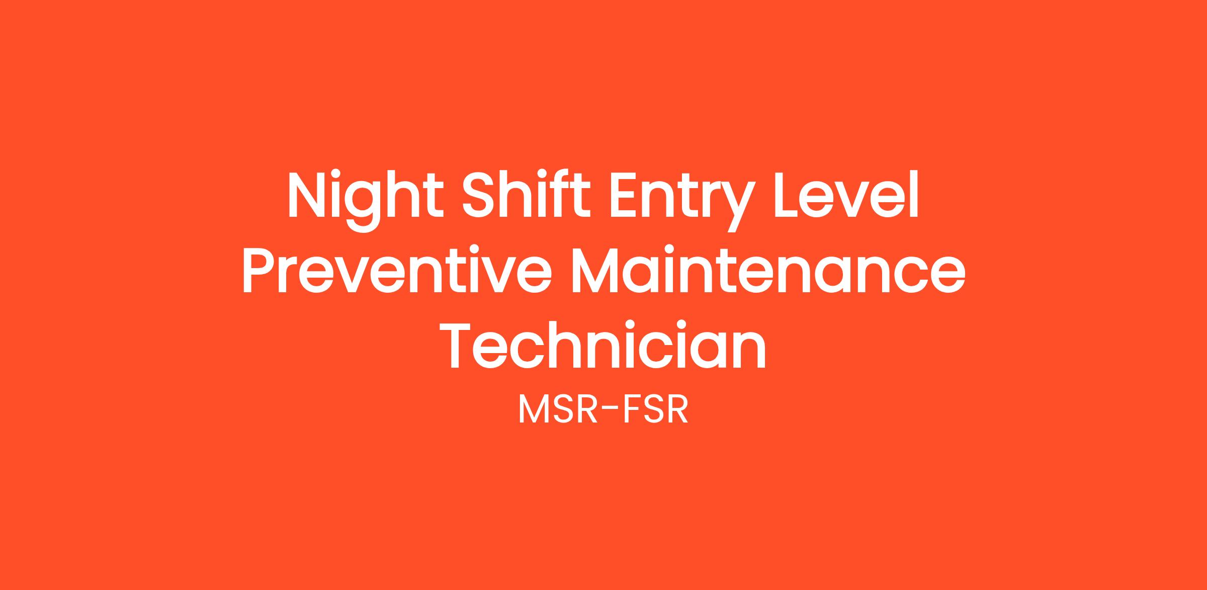 - Teamwork: MSR-FSR is a company who is trusted by their clients to provide top notch service, and we know that a variety of perspectives and experiences are essential to providing that service. As an Entry Level Preventive Maintenance Technician, you will work on a team of technicians that rely on collaboration, proactive problem solving, and strong communication to help each other reach their highest potential!