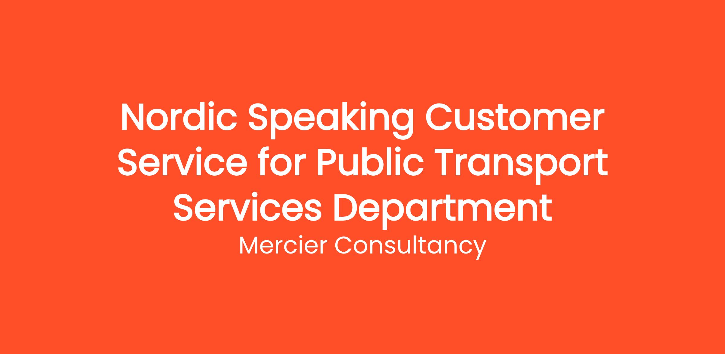 Mercier Consultancy is excited to announce an opening for a Nordic Speaking Customer Service Representative for our client's Public Transport Services Department. In this essential entry level role, you will provide outstanding support to our Nordic-speaking customers, assisting them with inquiries and concerns related to public transport services.