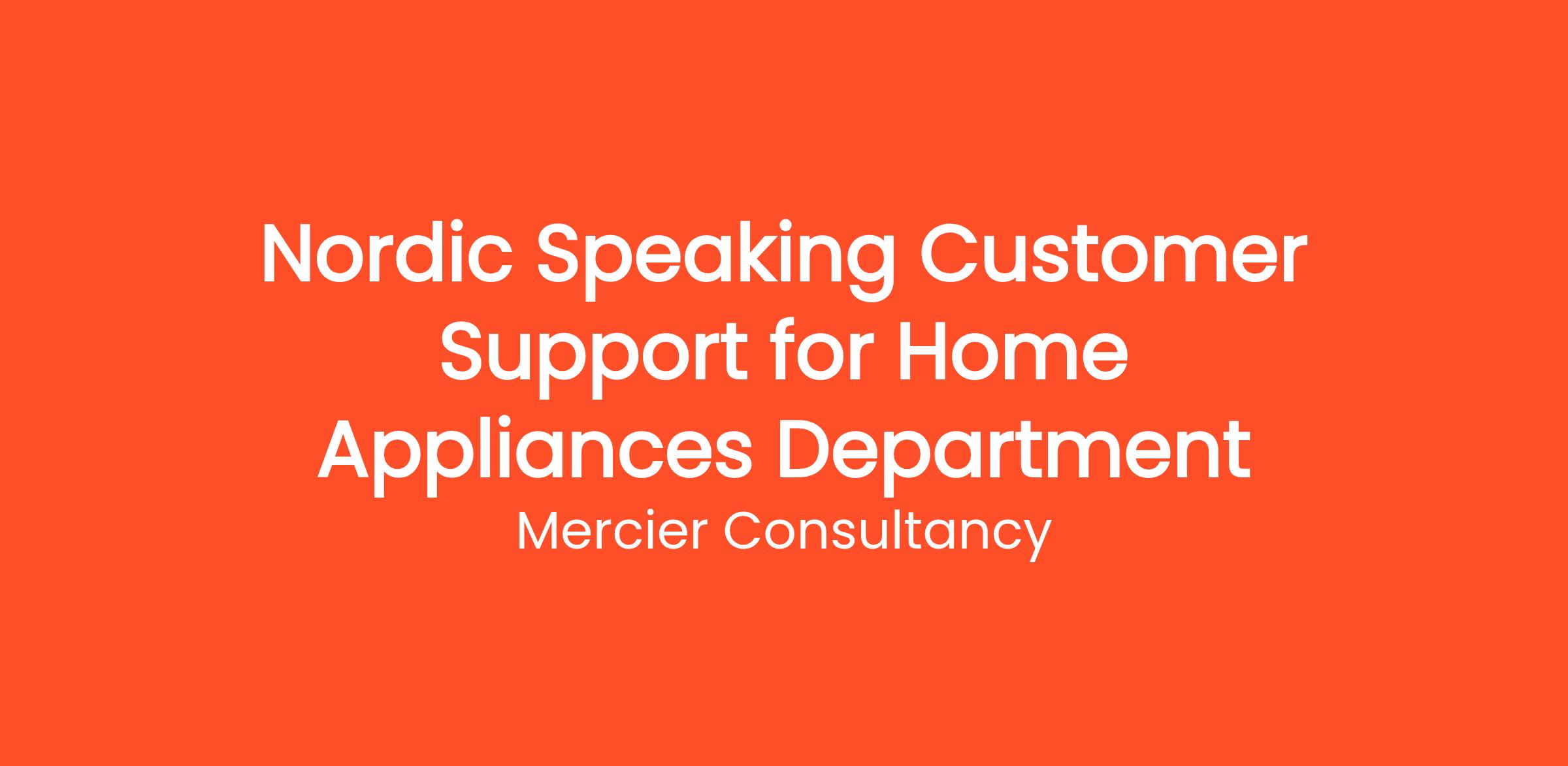 Mercier Consultancy is excited to announce a rewarding opportunity for a Nordic Speaking Customer Support Representative for our Client's Home Appliances Department! In this entry level role, you will be the primary point of contact for our Nordic-speaking customers, providing outstanding support and assistance regarding their home appliance inquiries. Your linguistic skills will enable you to effectively communicate and resolve customer concerns, ensuring a positive experience.