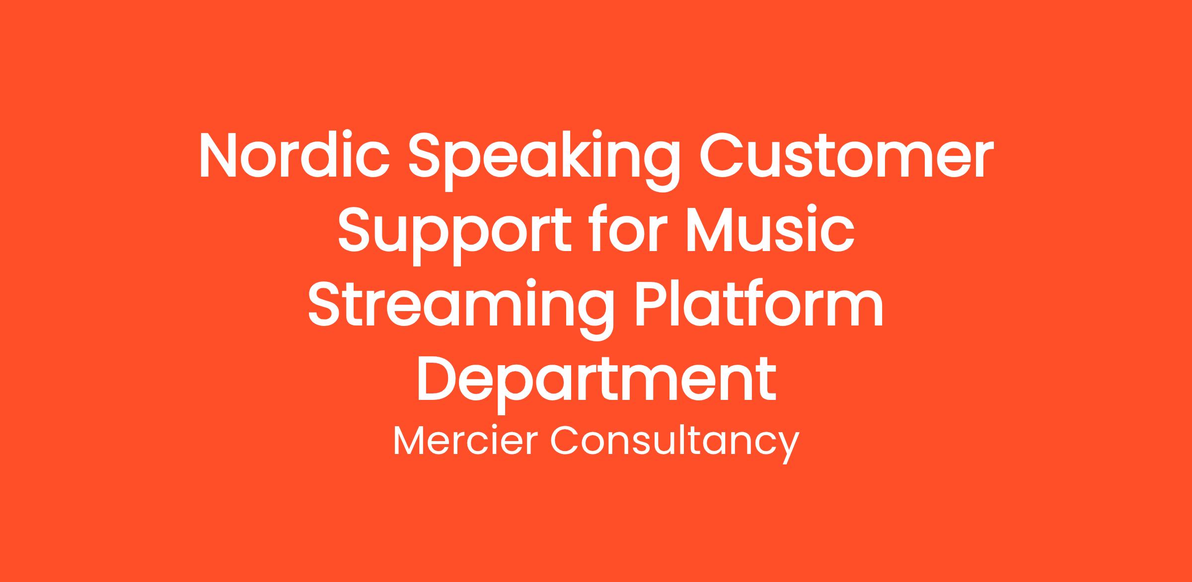 Mercier Consultancy is thrilled to announce an opening for a Nordic Speaking Customer Support Representative for our Client's Music Streaming Platform Department! In this exciting entry level role, you will be the main point of contact for our Nordic-speaking clients, providing them with exceptional support and assistance regarding our music streaming services. Your fluency in Nordic languages will help you connect with users and enhance their experience on our platform.