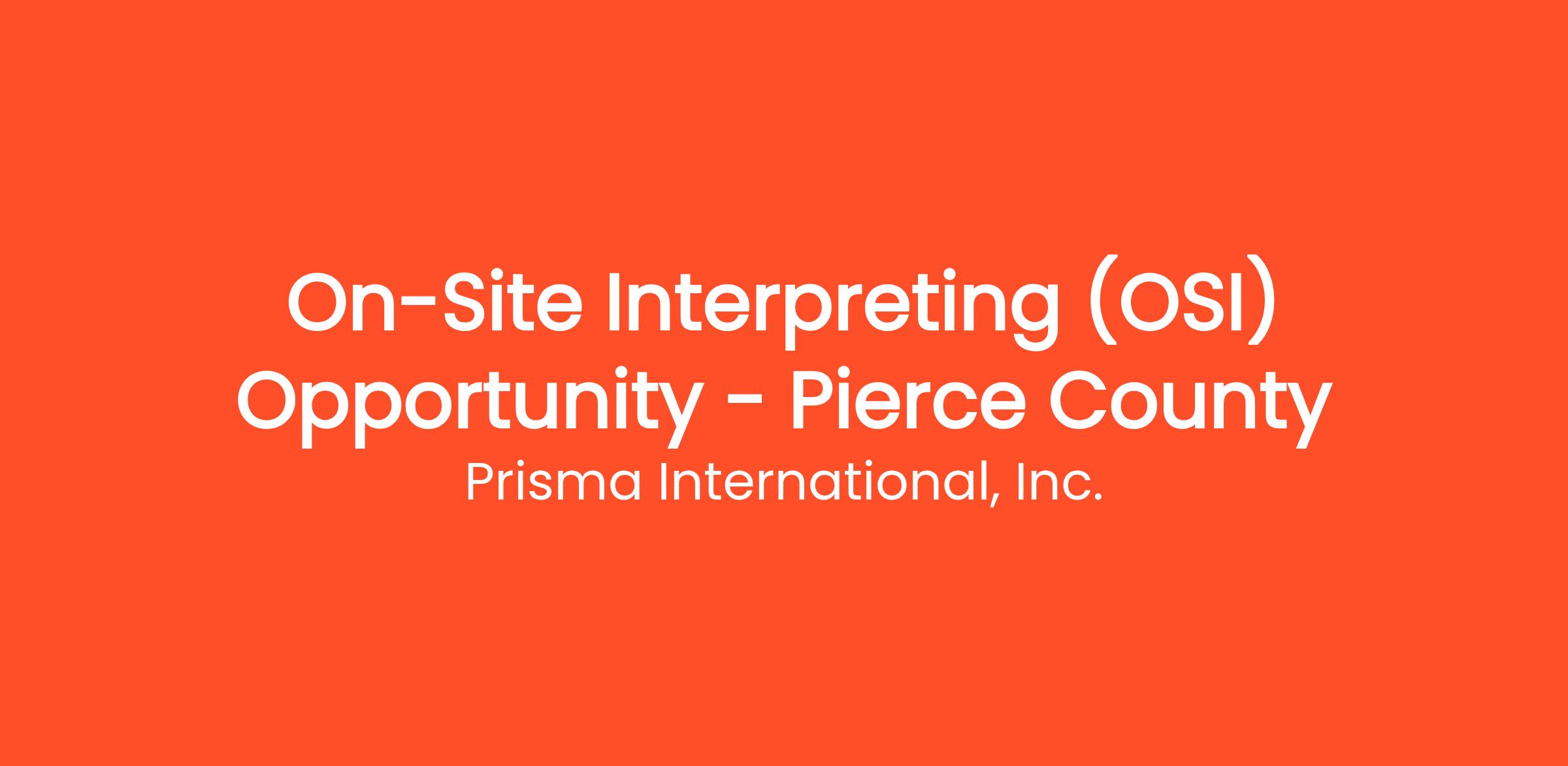 Prisma International, Inc. (Prisma) is actively seeking qualified, professional Interpreters, to join our team as Independent Contractors. As an Interpreter at Prisma, you will be supporting our State of Washington client with on-site (in person) interpretation (OSI) assignments in Pierce County. There may be opportunities for over-the-phone (OPI) and/or video remote (VRI) assignments.