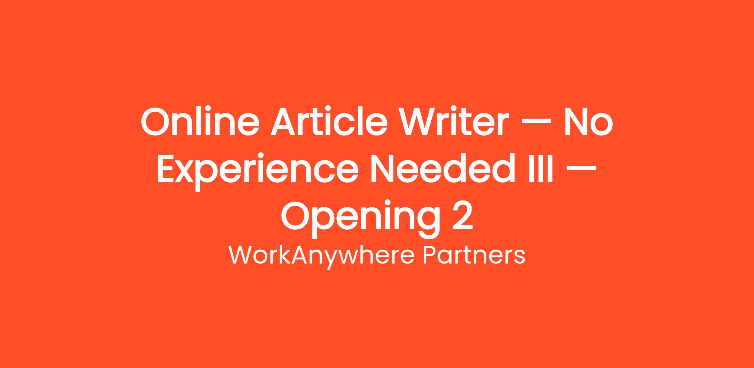 WorkAnywhere Partners is currently looking for motivated individuals to join our team as a Online Article Writer — No Experience Needed III — Opening 2. Earn money writing articles, blogs, and product descriptions from home. Flexible hours, multiple niches available, weekly pay. This is a fully remote, work-from-home position that can be done from anywhere in the United States. No prior experience is required — just a reliable internet connection and the motivation to learn. Whether you're looking to replace your current income or simply earn extra cash on the side, this flexible opportunity allows you to work as much or as little as you want.
