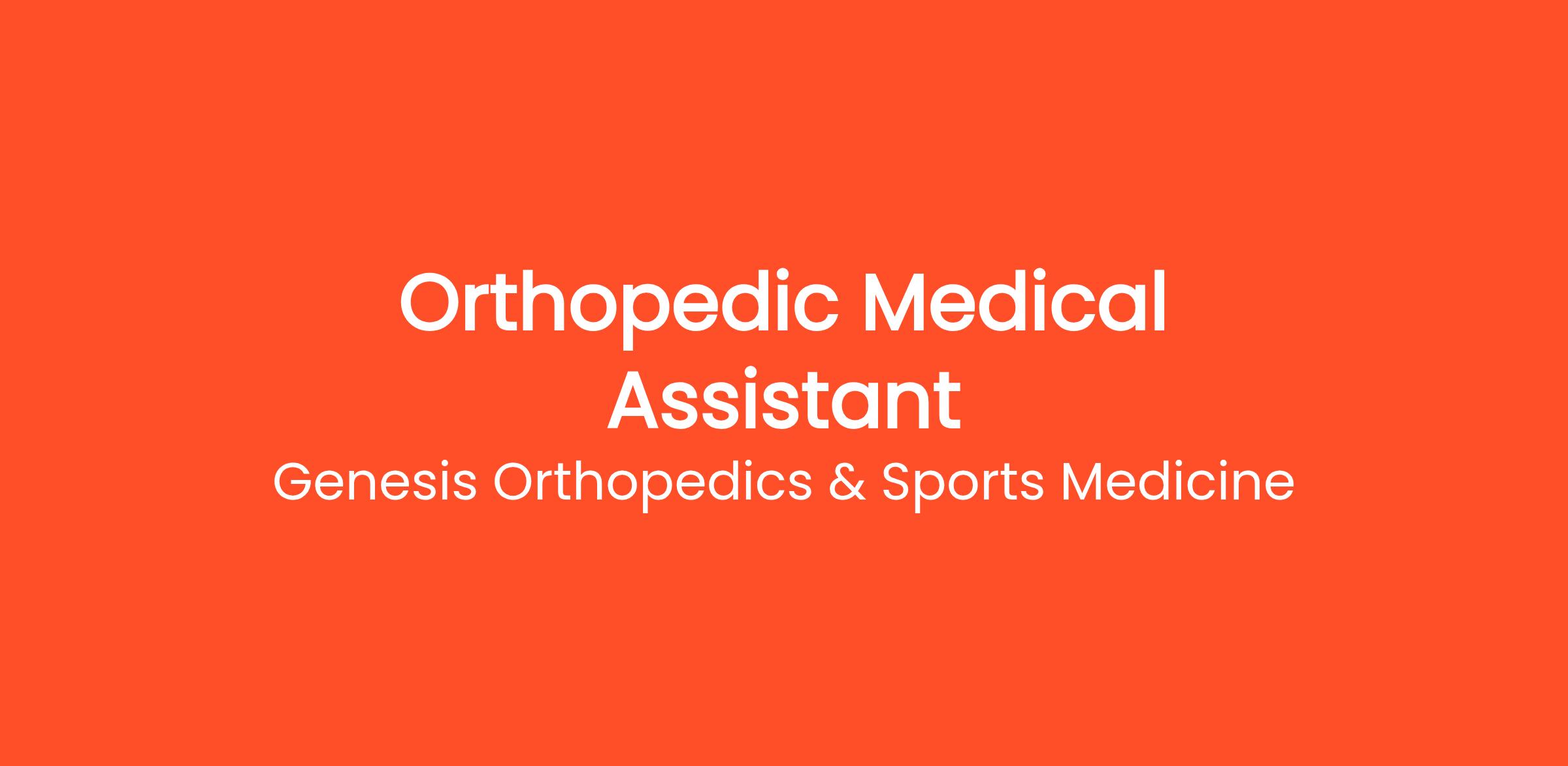 We are seeking a skilled Orthopedic Medical Assistant to join our team of healthcare professionals at Genesis Orthopedics & Sports Medicine. As an Orthopedic Medical Assistant, you will provide support to our physicians and help to ensure efficient operation of our orthopedic clinic. Your primary responsibilities will include taking patient histories, preparing patients for exams, assisting with procedures, and managing patient records.