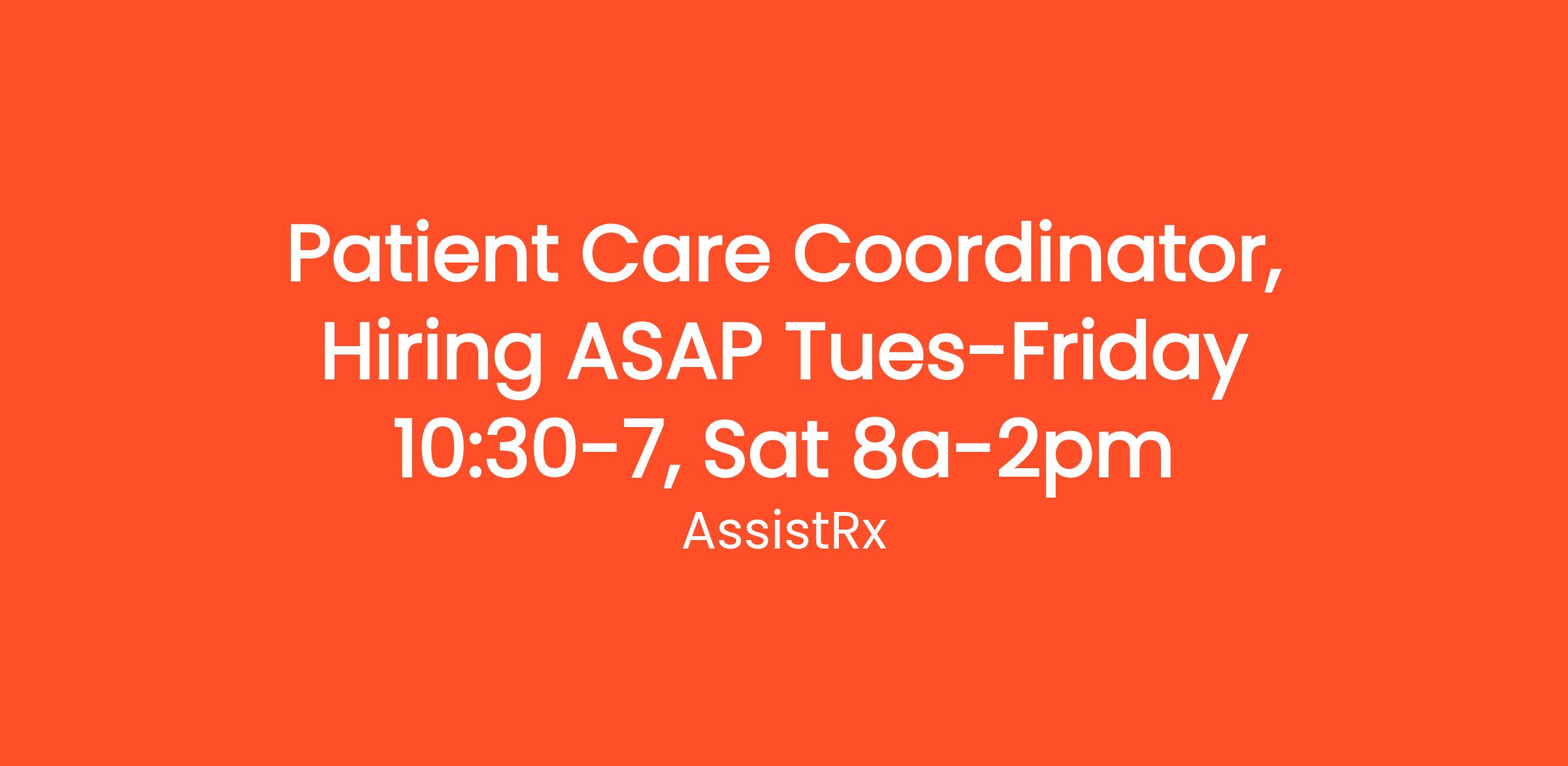 Patient Care Coordinator, Hiring ASAP Tues-Friday 10:30-7, Sat 8a-2pm