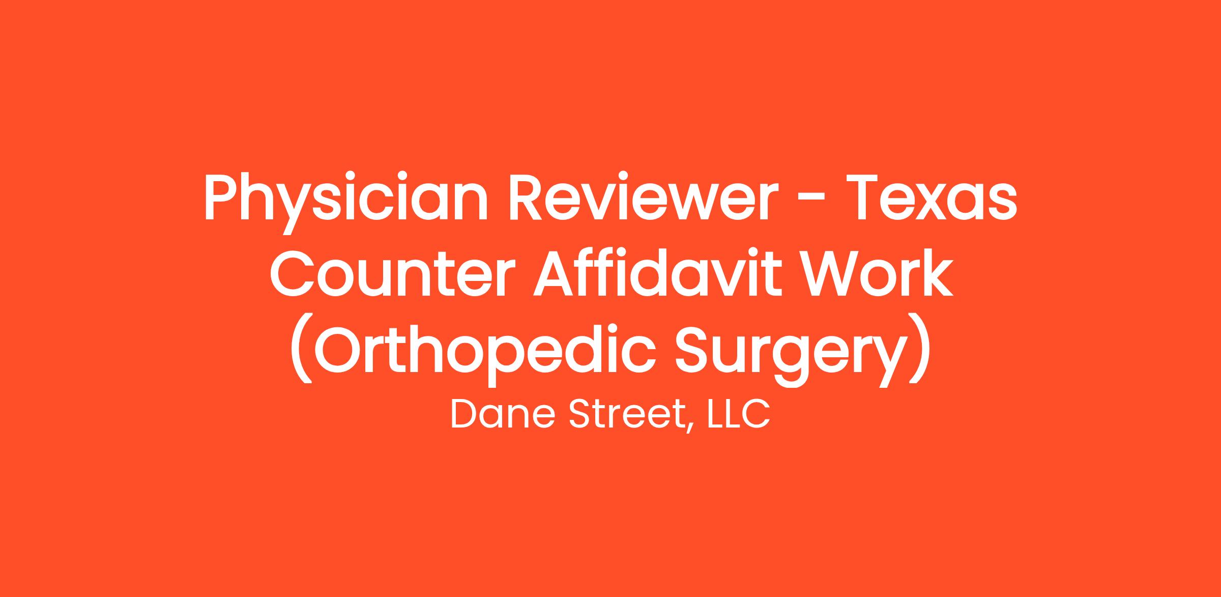 Candidates must be an Orthopedic Surgeon in the Dallas or Houston area and hold a TX License, with testimony/deposition/counter affidavit work experience. Candidates must also have access to a TX notary or be readily available for online notaries.