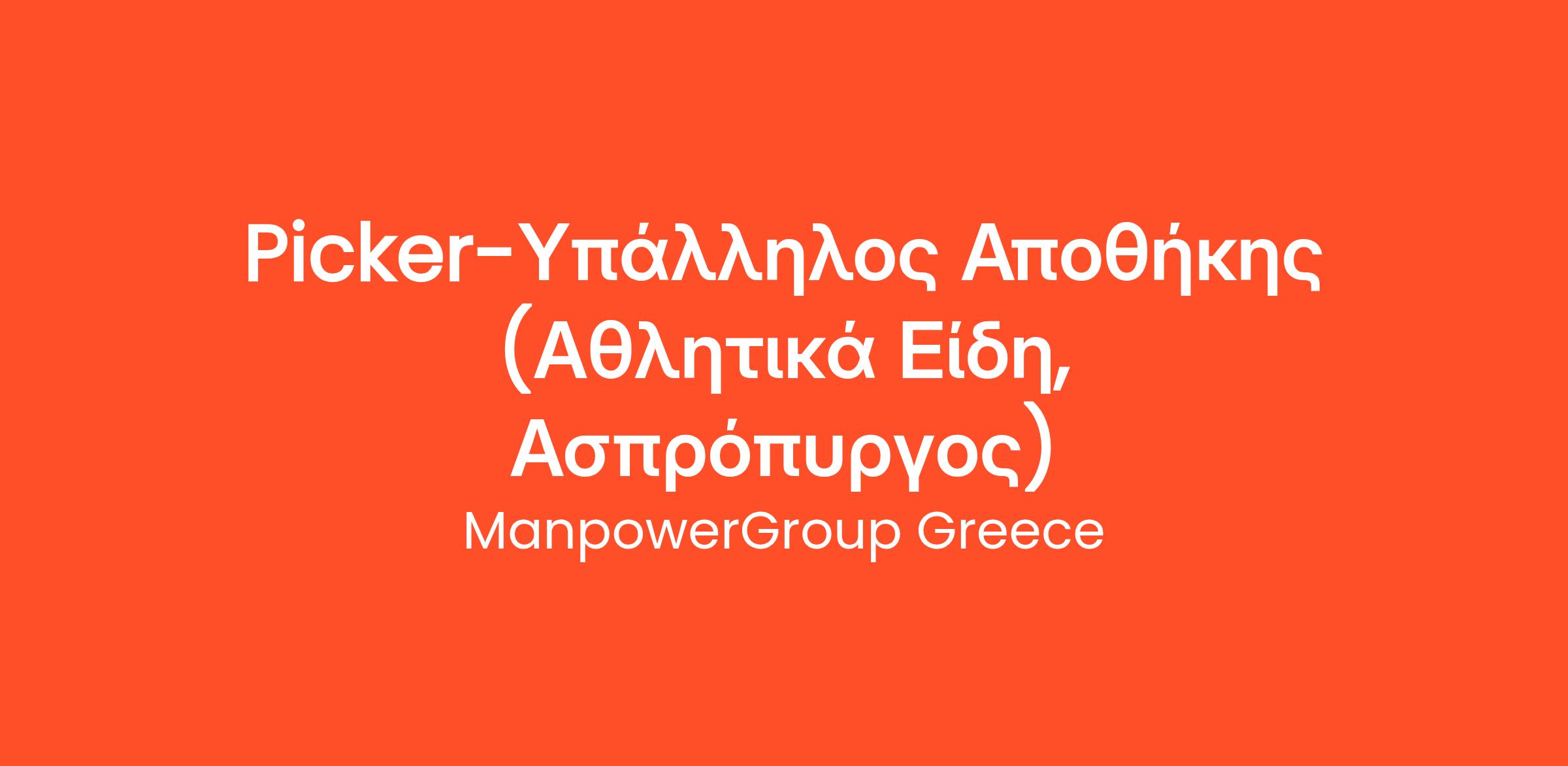 Η ManpowerGroup Greece, αναζητά για λογαριασμό κορυφαίας ελληνικής εταιρείας αθλητικών ειδών, δυναμικούς υποψηφίους που θα στελεχώσουν θέσεις Picker-Υπαλλήλου Αποθήκης, στις κεντρικές εγκαταστάσεις της εταιρείας στην περιοχή του Ασπροπύργου Αττικής.