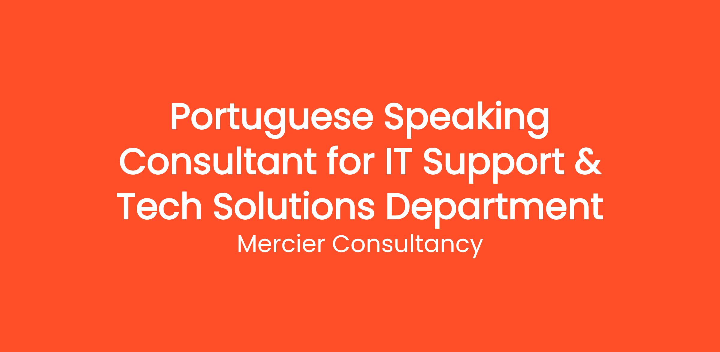Mercier Consultancy is excited to invite applications for a Portuguese Speaking Consultant to join our Client's IT Support & Tech Solutions Department. In this pivotal Entry Level role, you will serve as the primary point of contact for our Portuguese-speaking clients, providing expert support and solutions for their IT needs. Your contributions will play a crucial role in enhancing client satisfaction and ensuring that our clients’ technical challenges are addressed promptly and effectively.