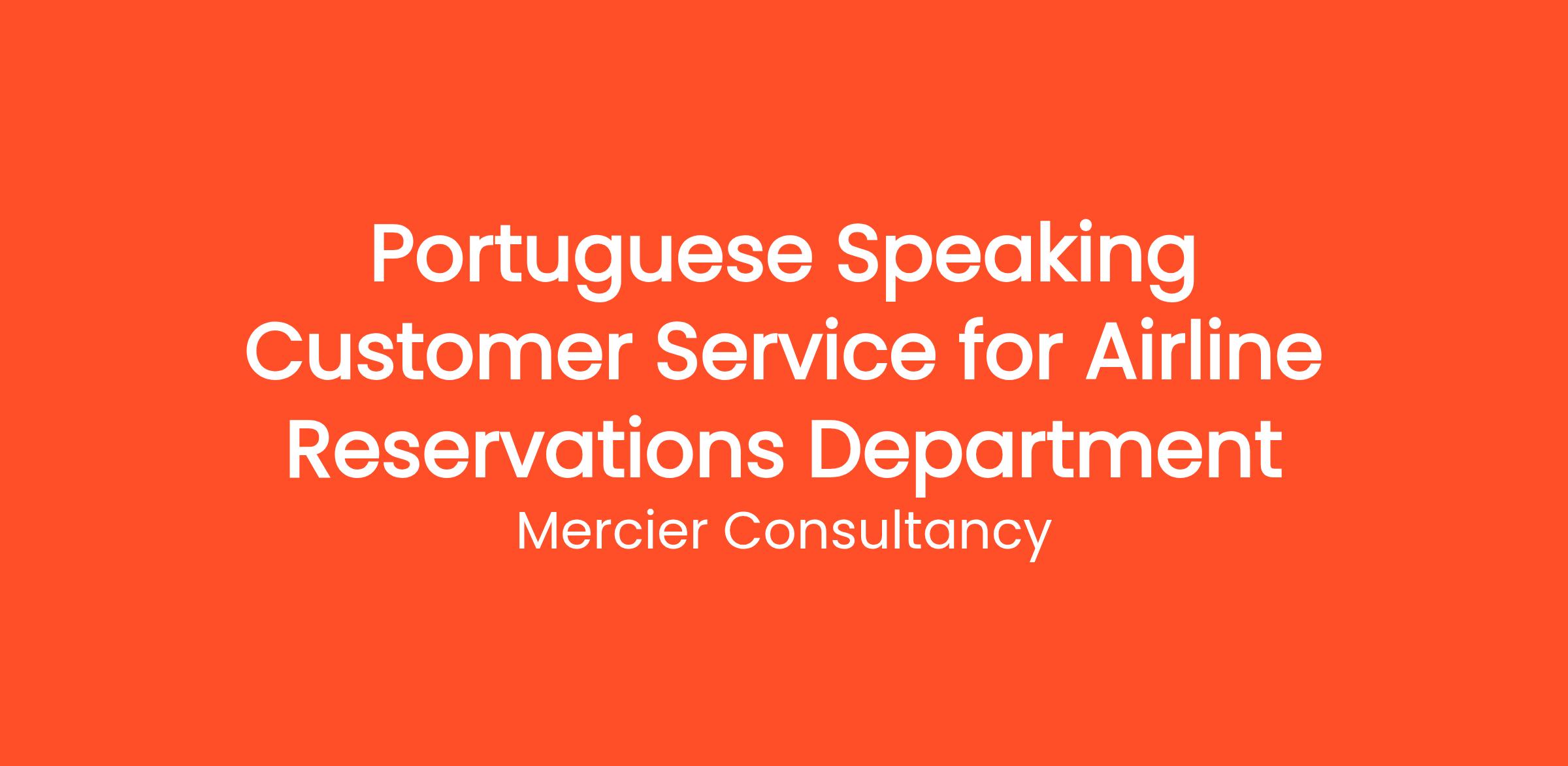Mercier Consultancy is looking for a dedicated Portuguese Speaking Customer Service Representative to join our Airline Reservations Department for one of our clients. In this pivotal Entry Level role, you will provide exceptional support to our Portuguese-speaking clients, assisting them with airline bookings, inquiries, and travel arrangements.