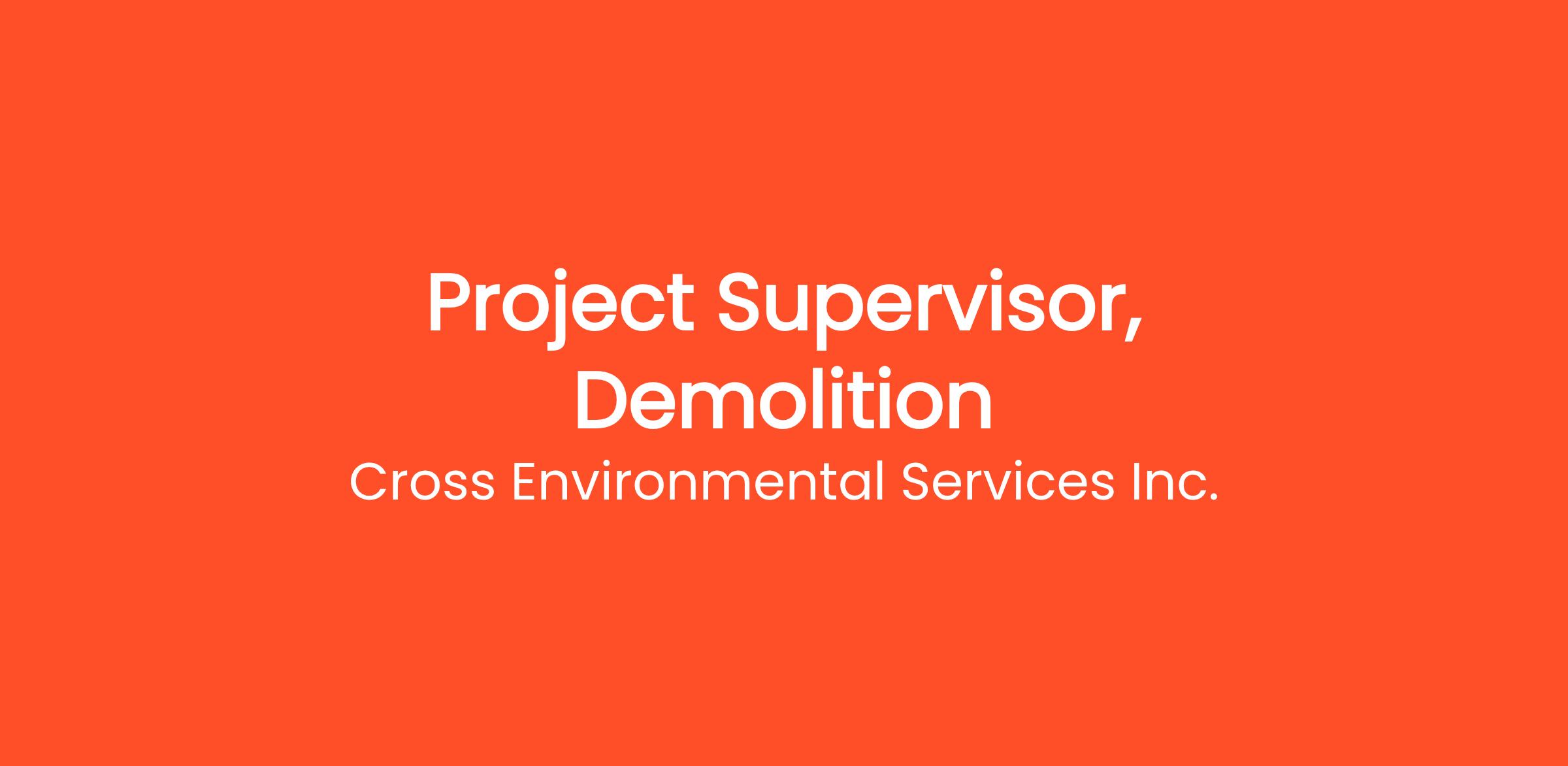Cross Environmental Services Inc. is seeking a highly qualified Project Supervisor with specialized expertise in demolition. The ideal candidate will possess a comprehensive understanding of project management within the demolition and hazardous materials sectors.
