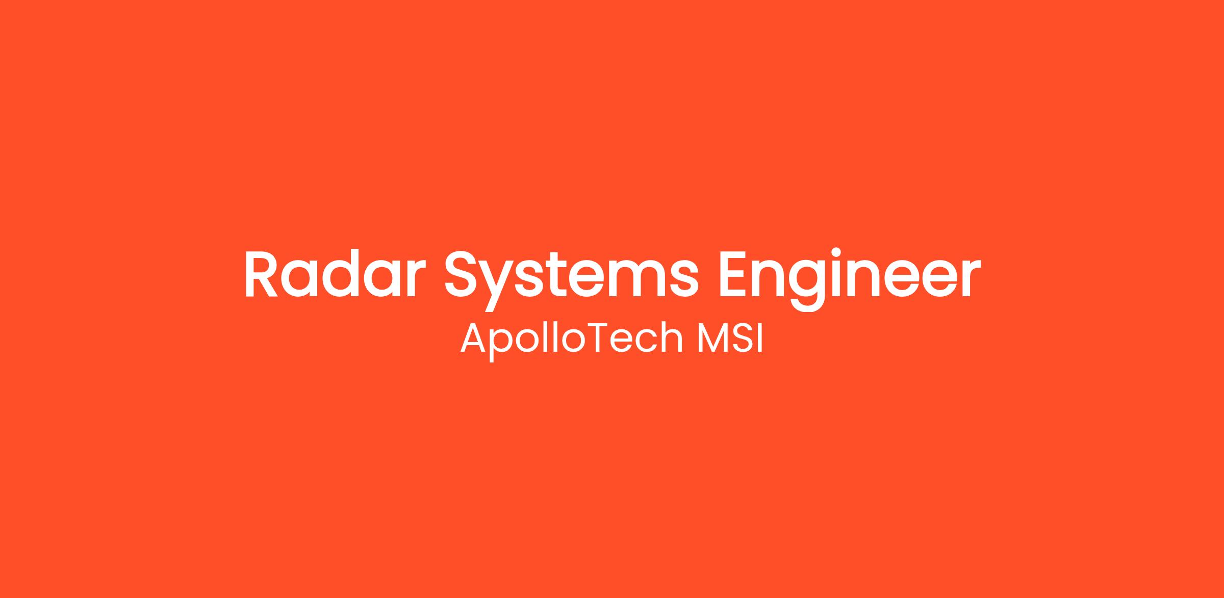 ApolloTech MSI offers an innovative and challenging work environment where you can contribute to advanced radar technologies and solutions. If you are a skilled Radar Systems Engineer excited about pushing the boundaries of radar systems and technology, we encourage you to apply and be part of our dedicated team.