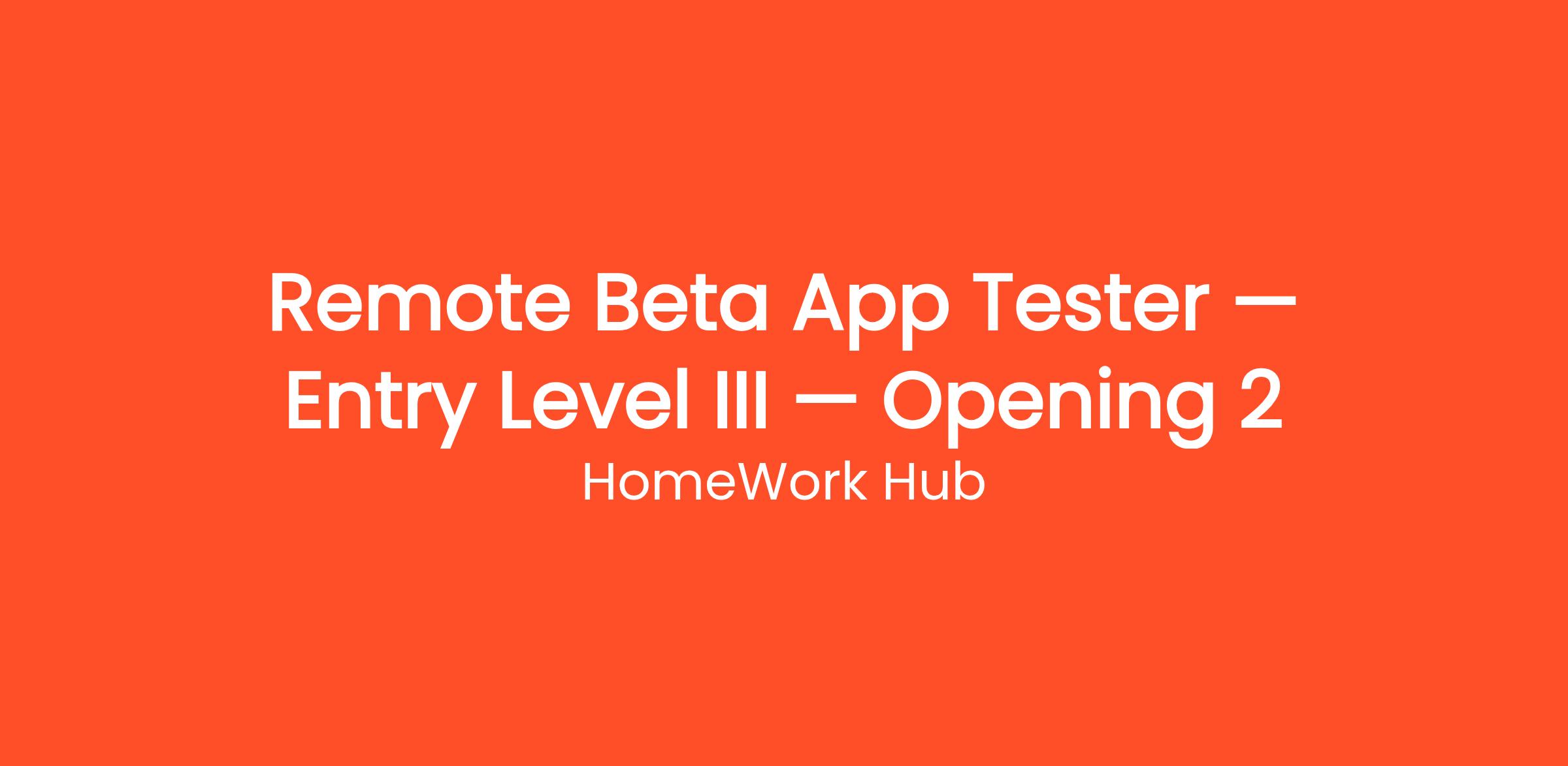 HomeWork Hub is currently looking for motivated individuals to join our team as a Remote Beta App Tester — Entry Level III — Opening 2. Get paid to test websites and mobile apps from home and give your honest feedback. No tech experience required. This is a fully remote, work-from-home position that can be done from anywhere in the United States. No prior experience is required — just a reliable internet connection and the motivation to learn. Whether you're looking to replace your current income or simply earn extra cash on the side, this flexible opportunity allows you to work as much or as little as you want.