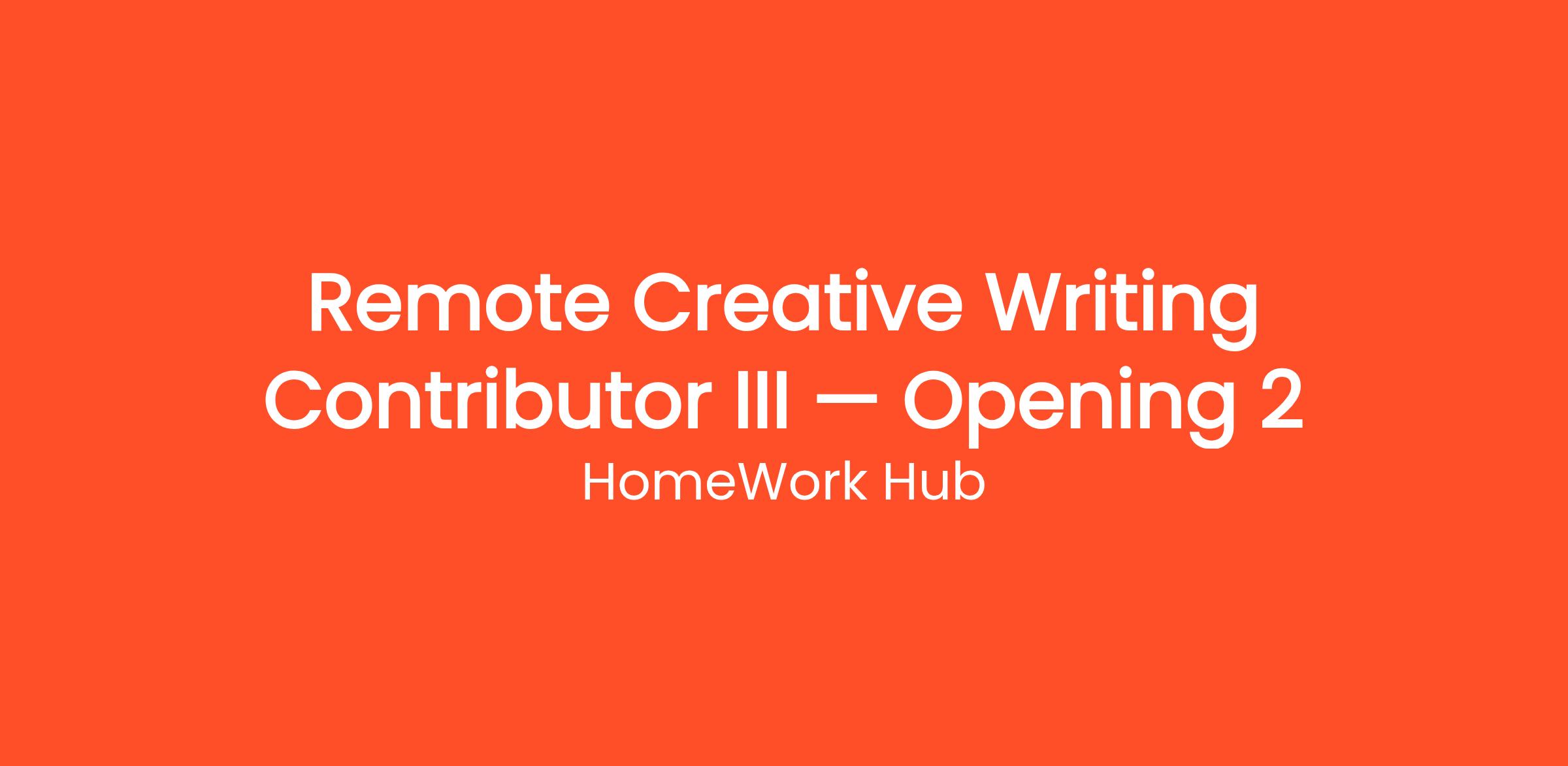 HomeWork Hub is currently looking for motivated individuals to join our team as a Remote Creative Writing Contributor III — Opening 2. Earn money writing articles, blogs, and product descriptions from home. Flexible hours, multiple niches available, weekly pay. This is a fully remote, work-from-home position that can be done from anywhere in the United States. No prior experience is required — just a reliable internet connection and the motivation to learn. Whether you're looking to replace your current income or simply earn extra cash on the side, this flexible opportunity allows you to work as much or as little as you want.