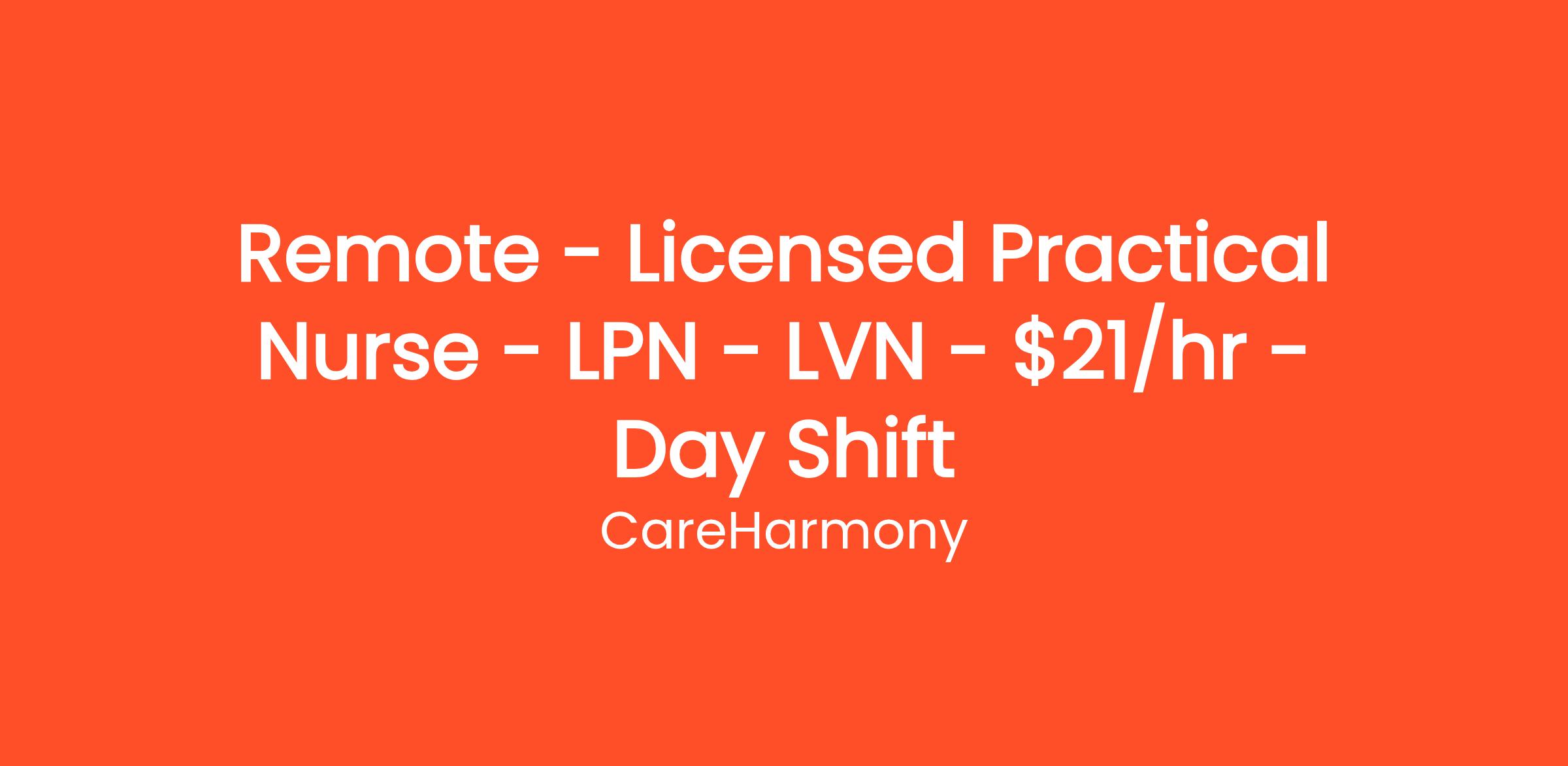 CareHarmony is seeking an experienced Licensed Practical Nurse to work 100% Remote – LPN Nurse (LPN) (LVN) with at least 3 years of direct patient-facing work experience; that thrives in a fast-paced environment, is self-motivated, has impeccable attention to detail, and values the impact they can have on a patient’s healthcare journey.