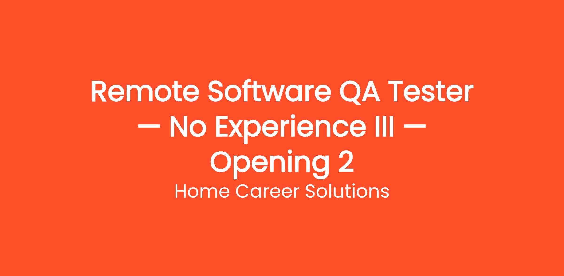 Thousands of people are already working from home as a Remote Software QA Tester — No Experience III — Opening 2 with Home Career Solutions. Get paid to test websites and mobile apps from home and give your honest feedback. No tech experience required. This work-from-home opportunity requires no commute, no degree, and no special prior experience. Get started on your own terms — choose your own hours and work as many or as few hours per week as you need. Payouts are processed regularly with multiple withdrawal options so you always get paid on time.