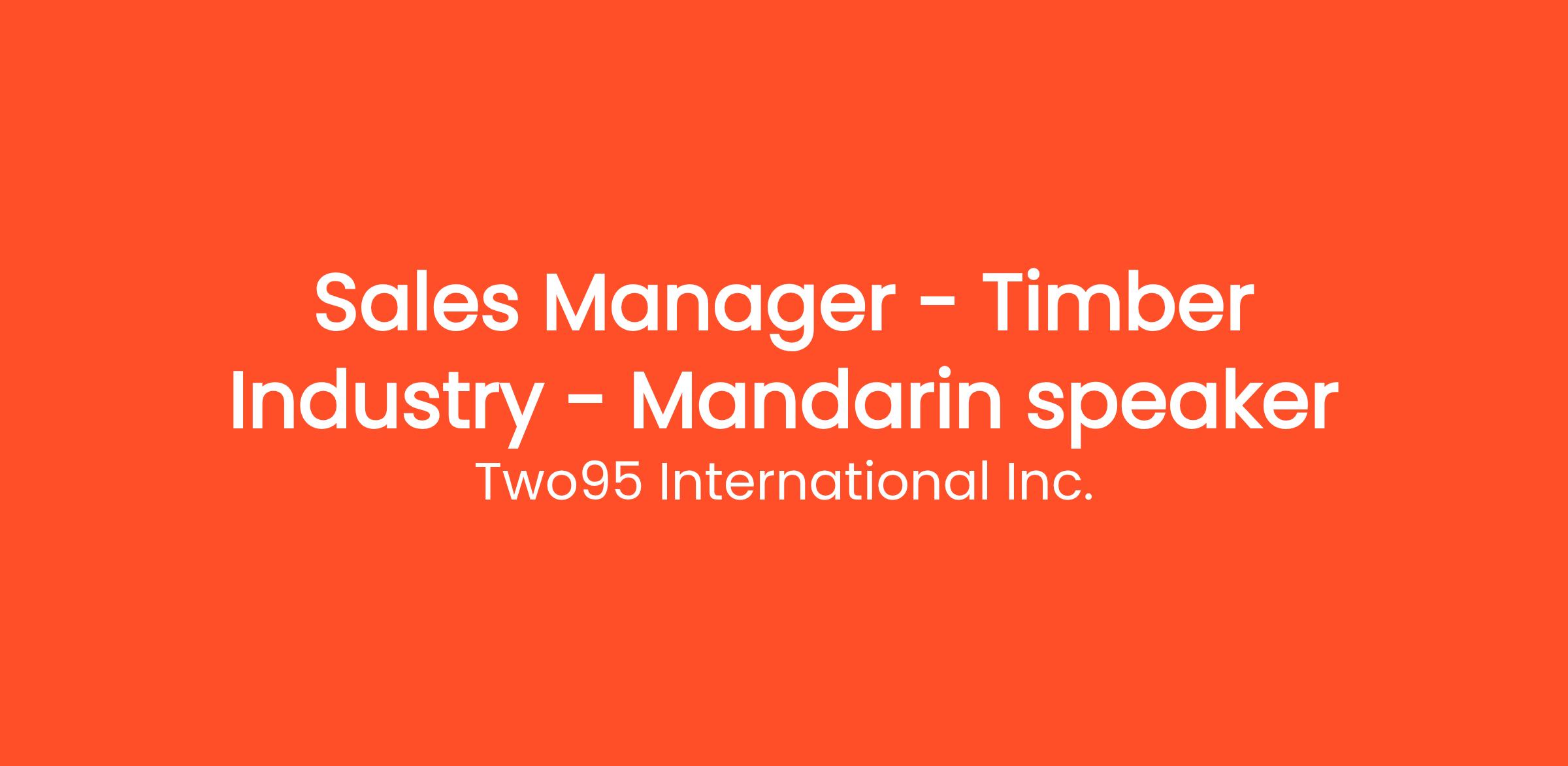 We are seeking a highly motivated Sales Manager to join our team at Two95 HR HUB ,As a global technology firm specializing in enterprise solutions, we are looking for a Sales Manager who is fluent in Mandarin and has experience in the Timber Industry. You will be responsible for developing and maintaining relationships with clients in the Timber Industry and driving sales growth. Your role will be to understand the needs of our clients and offer them the best enterprise solutions. Two95 has been recognized as the fastest-growing recruiters. We offer a dynamic and innovative work environment that fosters growth and development.