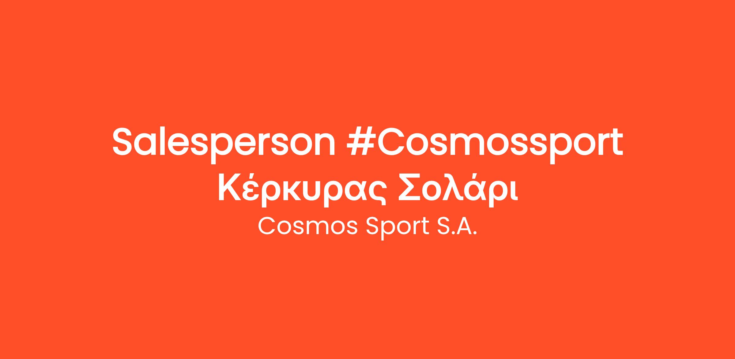 Αναζητούμε Salesperson για το κατάστημα Cosmos Sport Κέρκυρας Σολάρι! Αν είσαι ομαδικός παίκτης & λατρεύεις τον αθλητισμό και το athleisure στυλ, τότε θέλουμε να σε γνωρίσουμε!