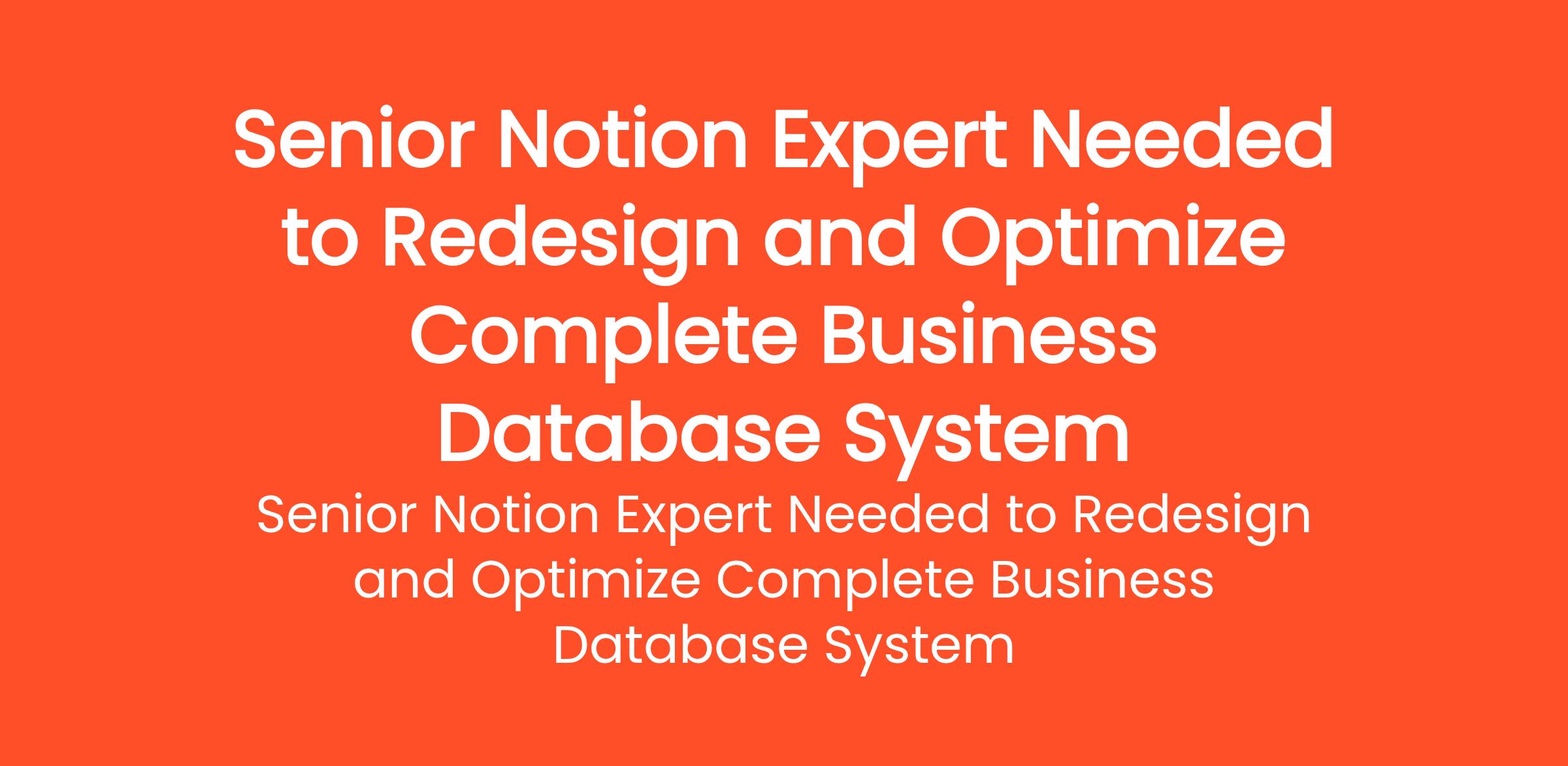 Job Description We are looking for a highly experienced Notion expert to completely redesign, optimize, and restructure our existing business database system. This is NOT a basic setup job. We need someone... (Budget: €250 - €750 EUR, Jobs: Data Architecture, Database Administration, Database Design, Database Development, Database Programming, Microsoft Access, Notion, Relational Databases)