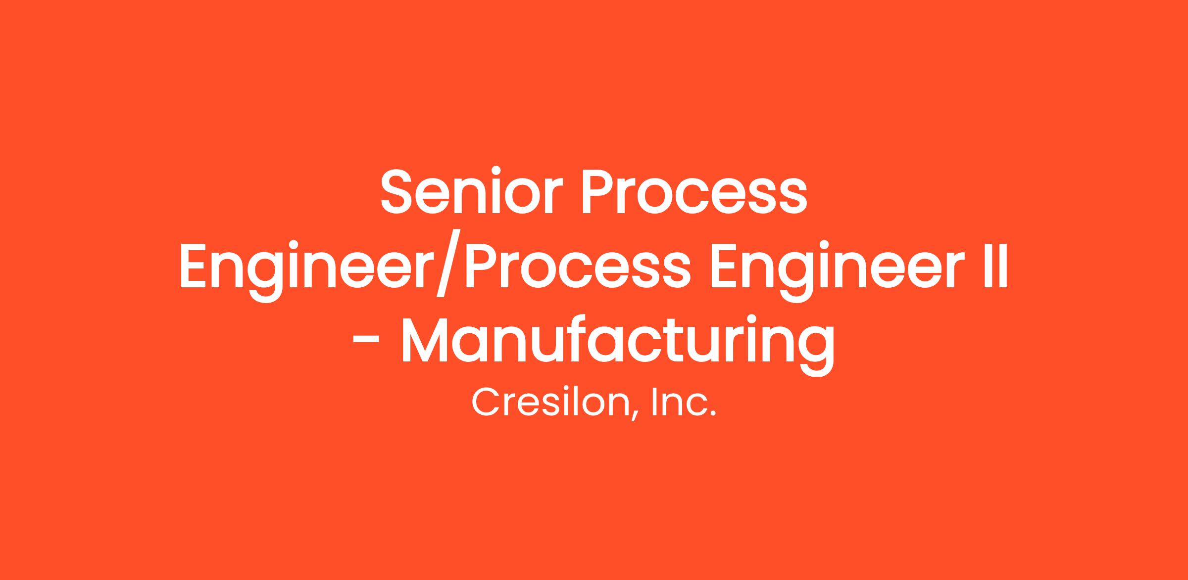 · Senior Process Engineer: 10+ years of experience in a regulated manufacturing environment with at least 5 years hands-on experience in process development, design, and process implementation required, preferably in medical device, pharmaceutical, or biotech manufacturing.