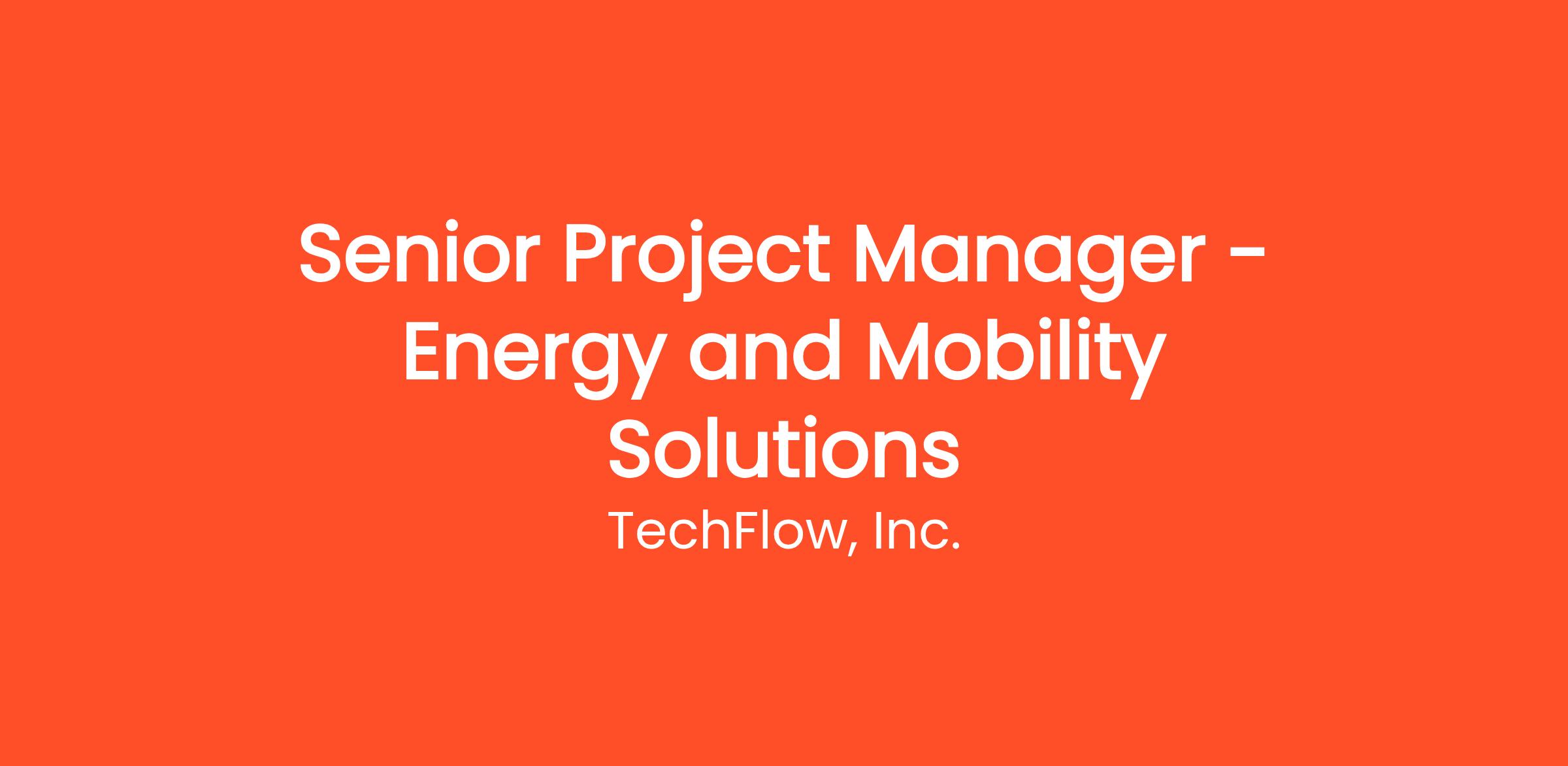 TechFlow seeks to hire a Senior Project Manager to support our growing Energy and Mobility Solutions Business Unit within the Eastern US. The Project Manager will work across functions to support Energy and Mobility projects within the Business Unit. The Project Manager will also provide leadership and direction to project teams and will be responsible for planning, delivery, management, and oversite of assigned projects.