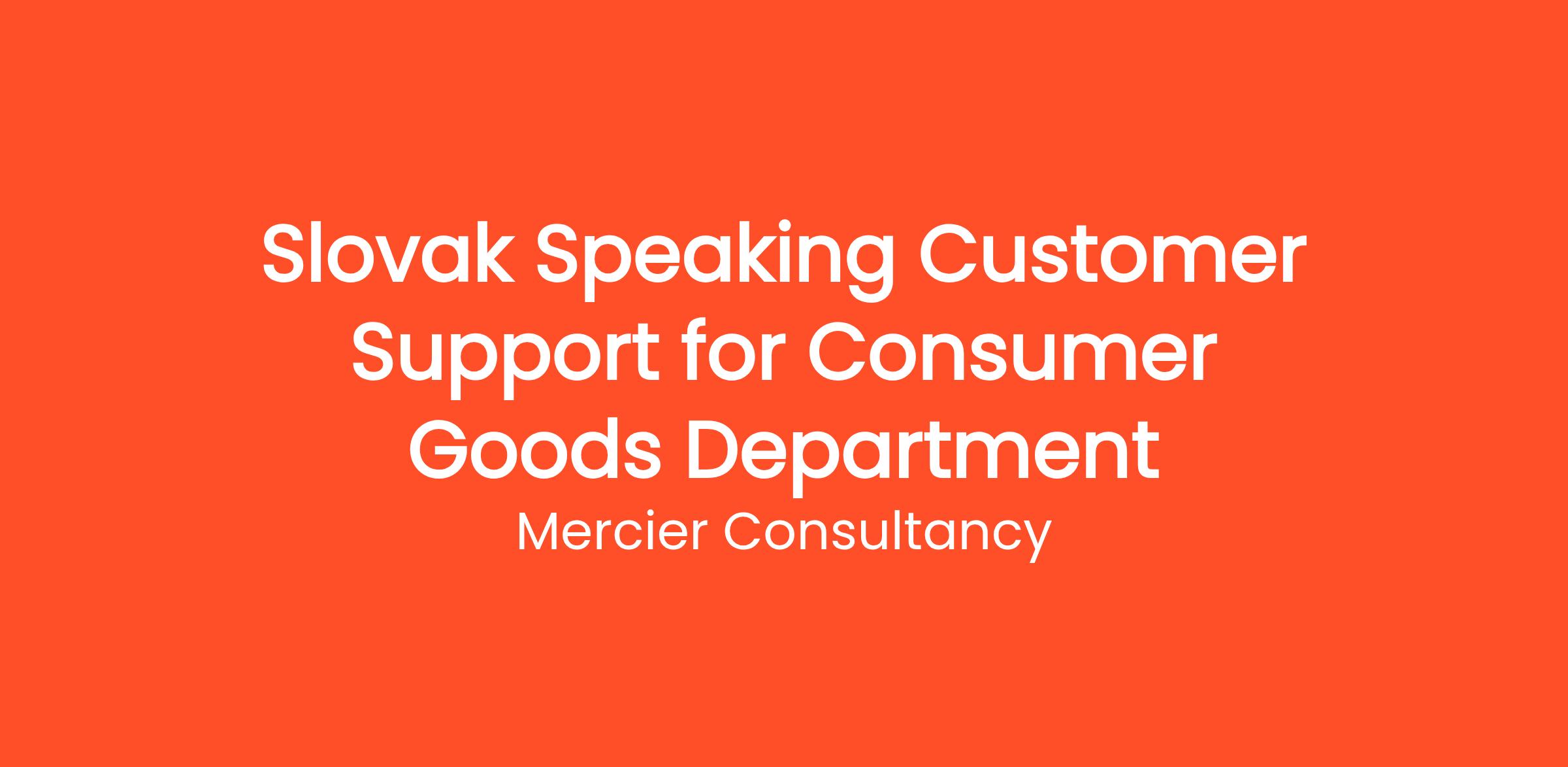Mercier Consultancy is thrilled to announce an opening for a Slovak Speaking Customer Support Representative for our Client's Consumer Goods Department! In this essential Junior role, you will be the primary point of contact for our Slovak-speaking customers, assisting them with their inquiries and providing support regarding our diverse range of consumer goods. Your expertise in the Slovak language will be vital in ensuring a seamless customer experience.