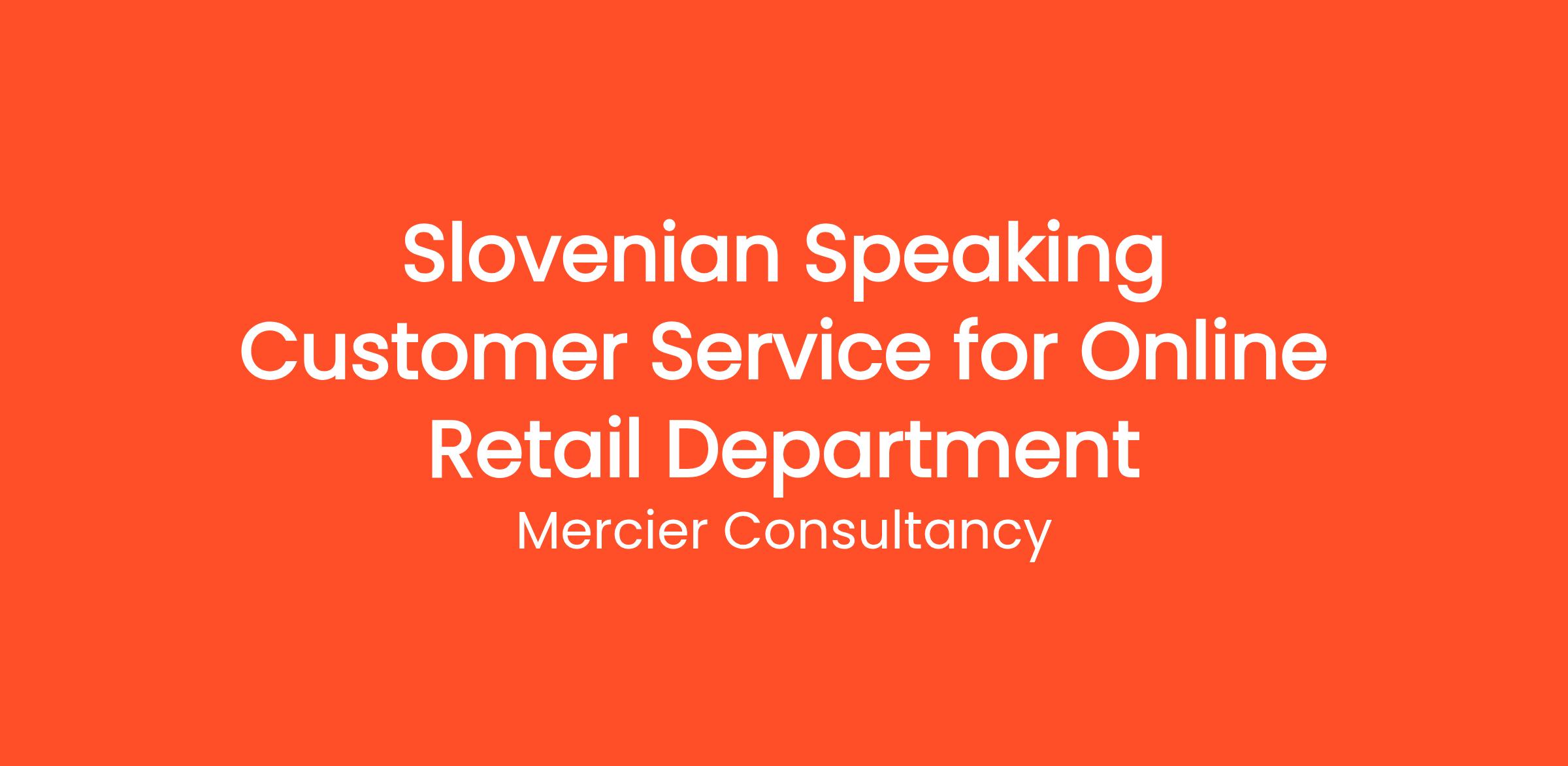 Mercier Consultancy is thrilled to announce an opening for a Slovenian Speaking Customer Service Representative for our client's Online Retail Department. In this dynamic entry level role, you will be the primary point of contact for our Slovenian-speaking customers, providing assistance with inquiries and issues related to their online shopping experience.