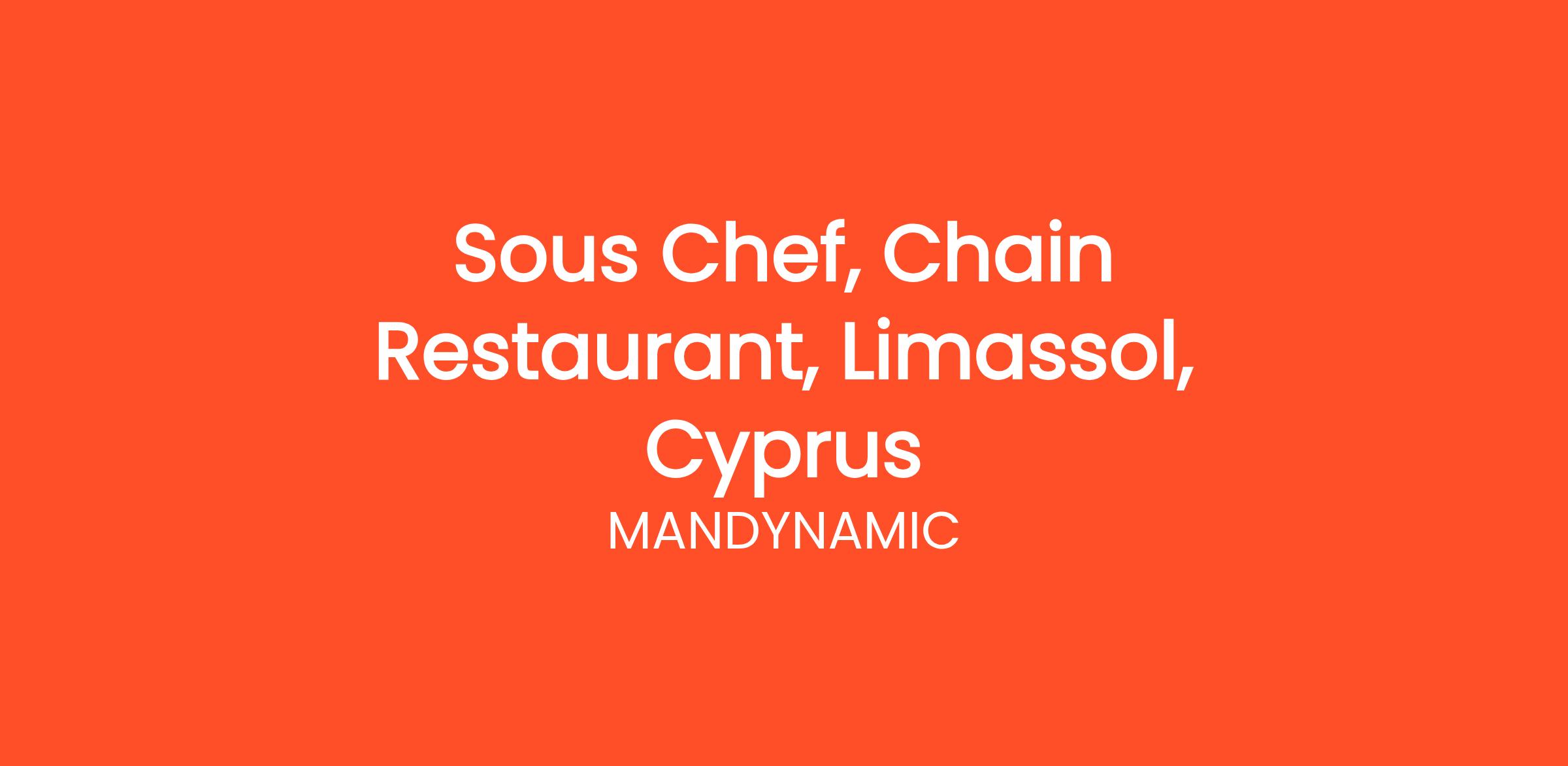 MANDYNAMIC is seeking Sous Chef on behalf of well known Chain Restaurants in Limassol, Cyprus. Candidates should have a positive attitude, responsibility and professionalism.