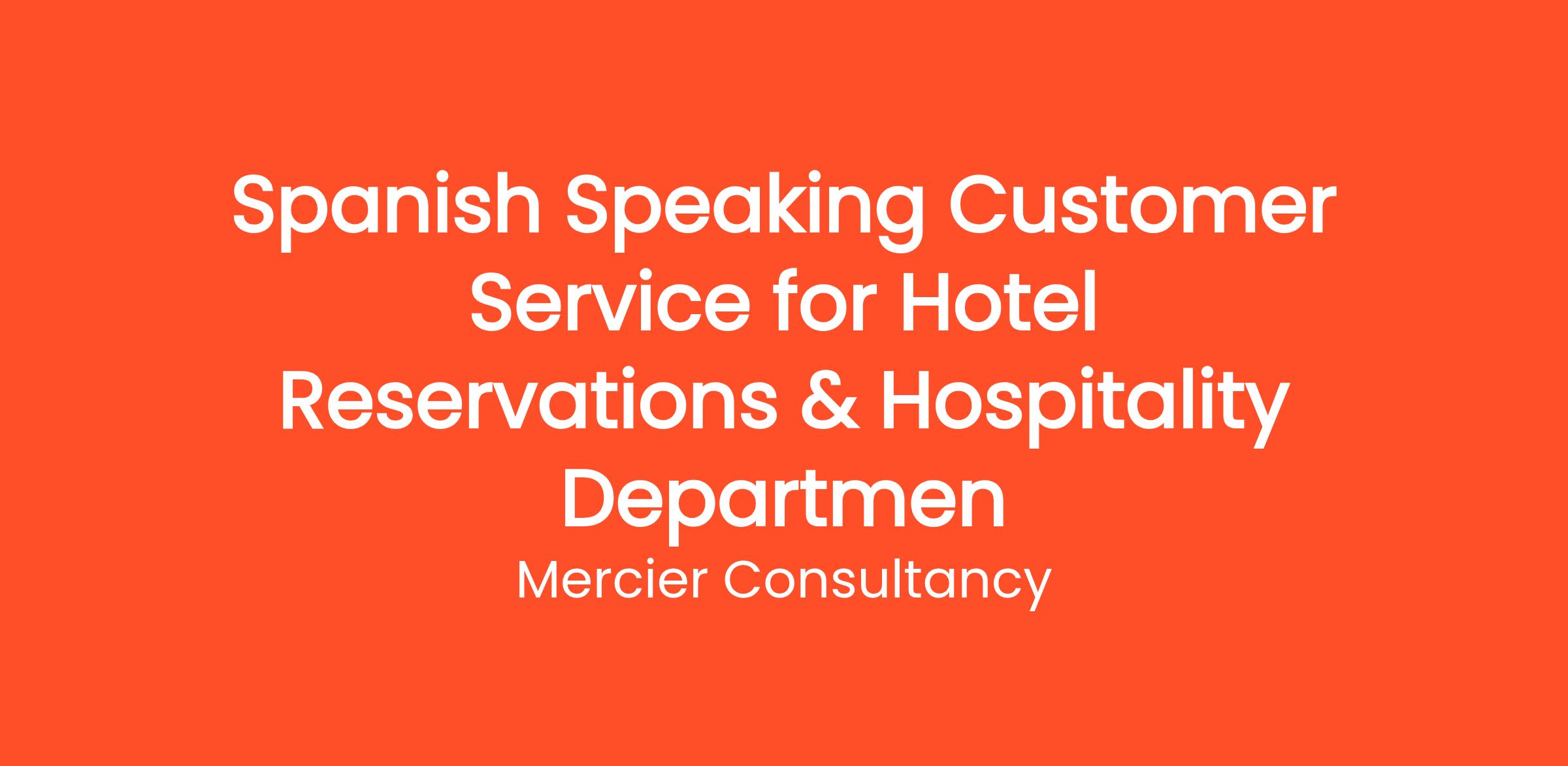 Mercier Consultancy is excited to announce a vacancy for a Spanish Speaking Customer Service Representative for our Client's Hotel Reservations & Hospitality Department. In this vital role, you will provide outstanding support to our Spanish-speaking clients, assisting them with inquiries, bookings, and any hospitality-related services.