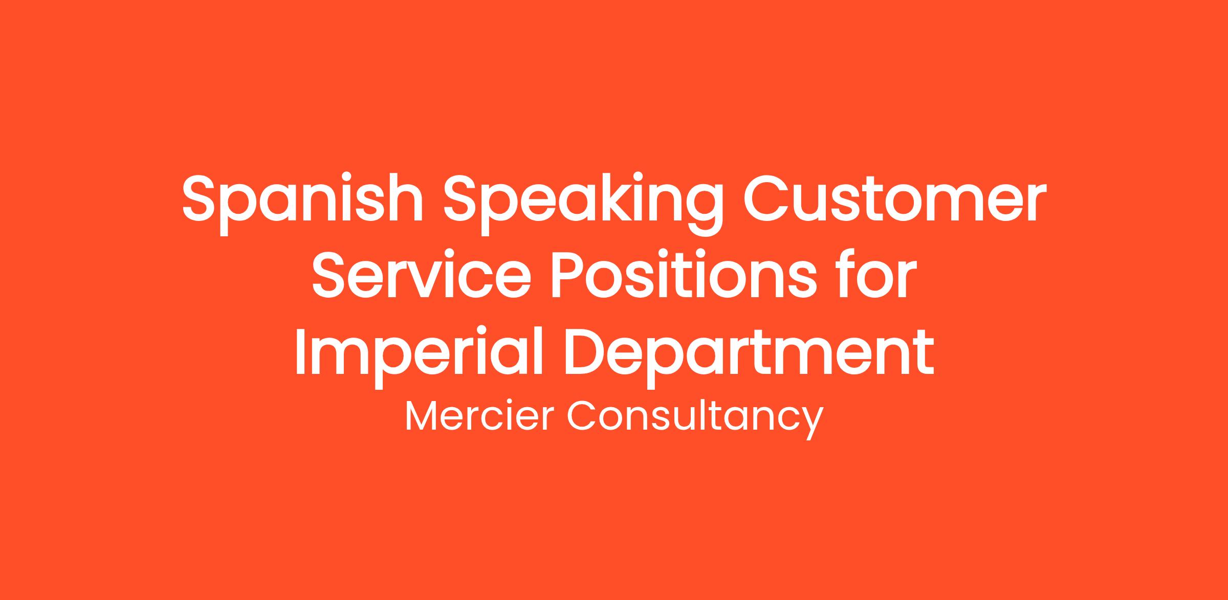 Mercier Consultancy is on the lookout for enthusiastic Spanish Speaking Customer Service Representatives to join our Imperial Department. In this vital position, you will be responsible for delivering outstanding customer support to our Spanish-speaking clientele, ensuring their experience with our services is smooth and satisfying.