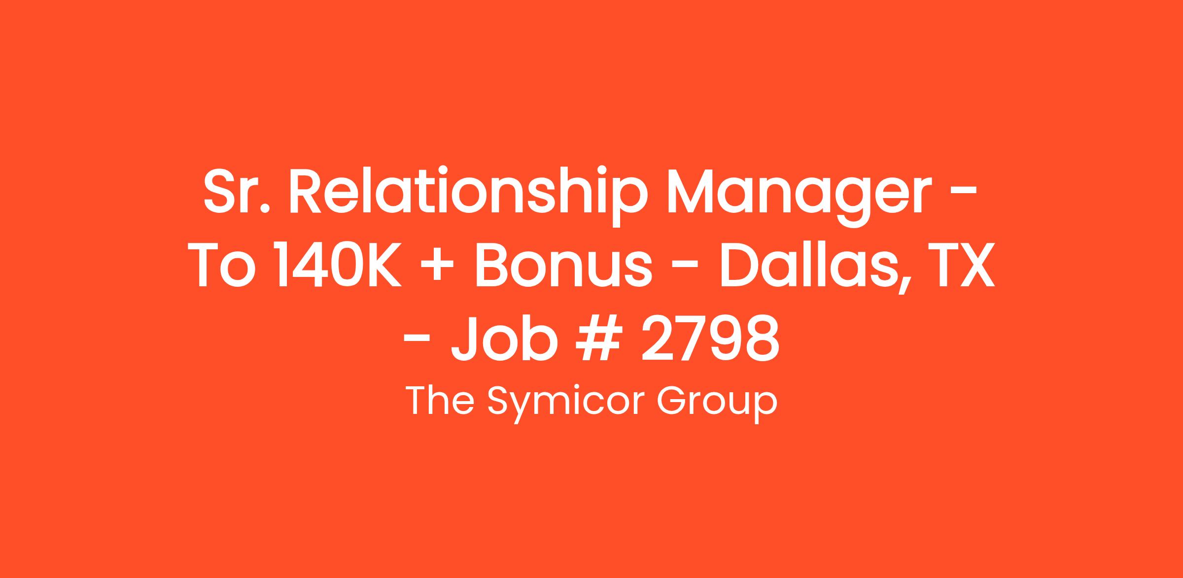 Our bank client is seeking to fill a Sr. Relationship Manager role in the Dallas, TX area. The successful candidate will engage in business development activities and solicitation of new business.