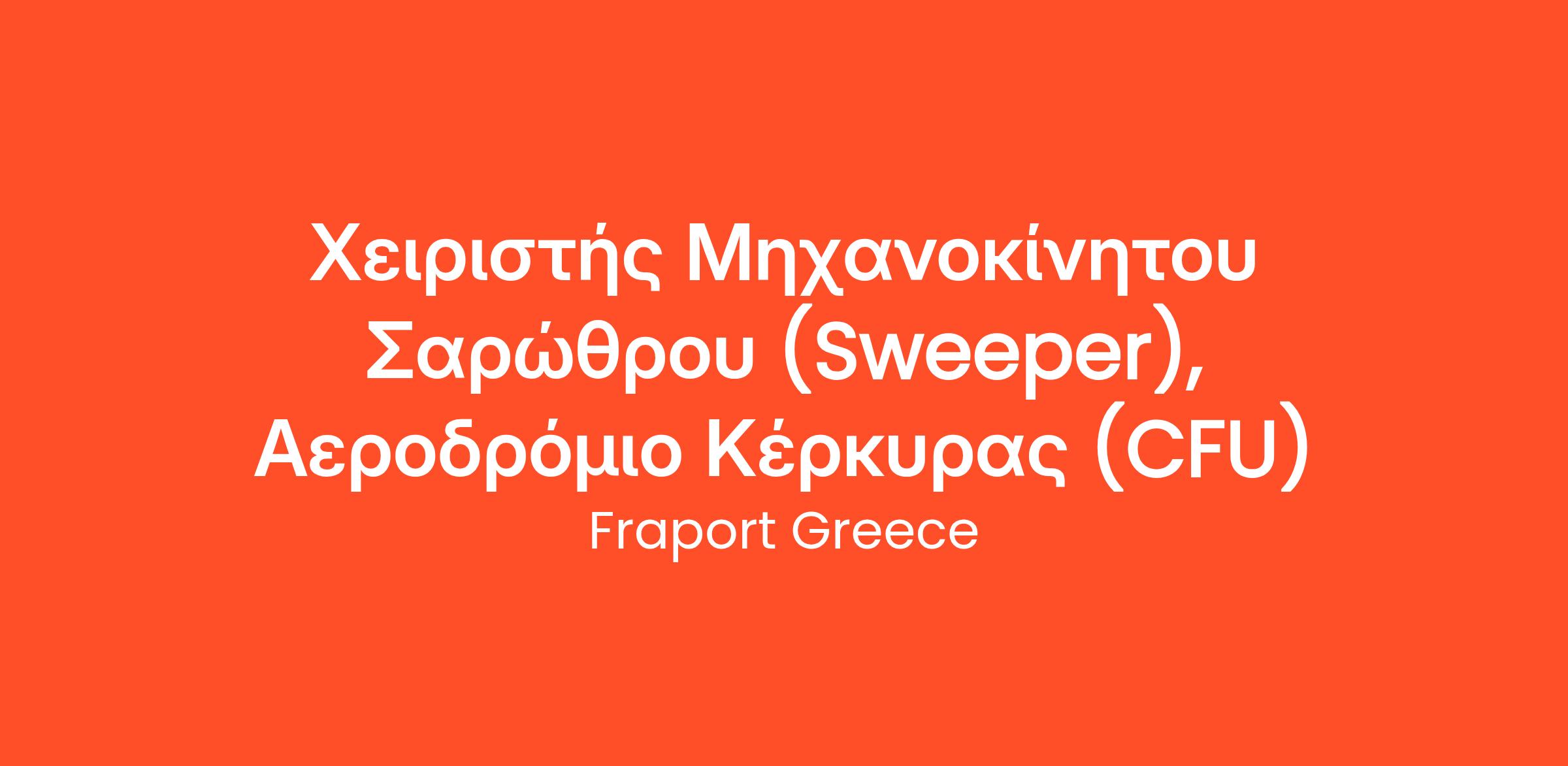 Η Fraport Greece, στο πλαίσιο του προγράμματος λειτουργίας και ανάπτυξης των 14 Περιφερειακών Αεροδρομίων, αναζητά Χειριστή Μηχανοκίνητου Σαρώθρου για το Αεροδρόμιο της Κέρκυρας.