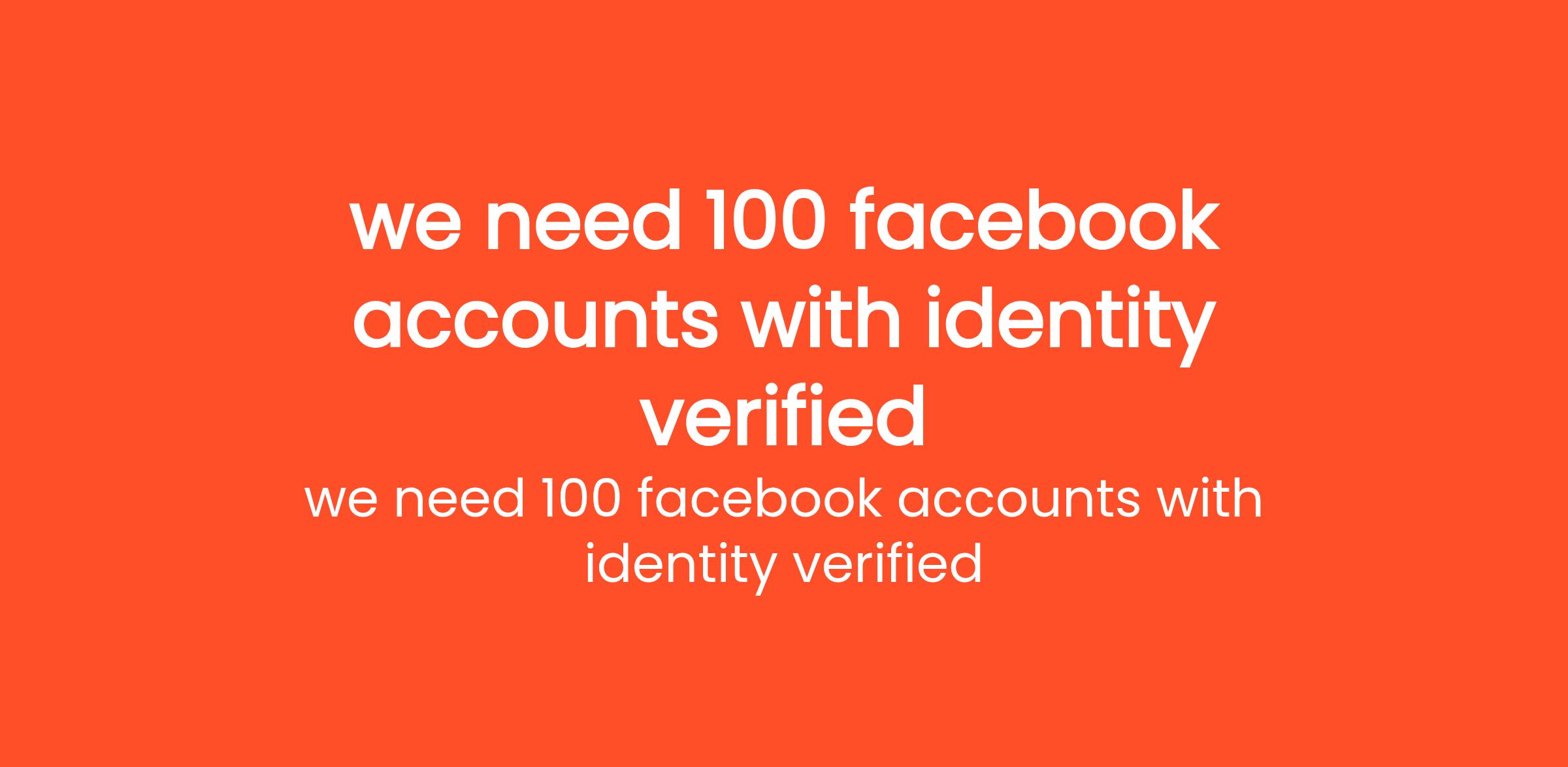 we need 100 facebook accounts with identity verified budget: 10$ (Budget: $10 - $30 USD, Jobs: Account Management, Content Creation, Data Entry, Digital Marketing, Email Marketing, Facebook Ads, Facebook Marketing, Social Media Management, Social Media Marketing, Social Networking)