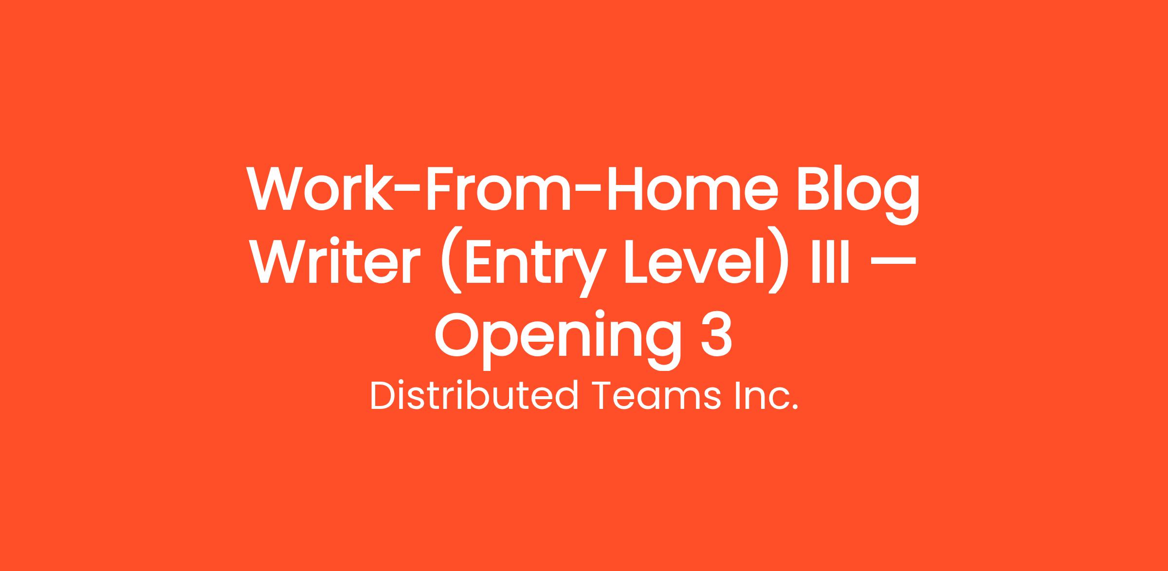 Distributed Teams Inc. is currently looking for motivated individuals to join our team as a Work-From-Home Blog Writer (Entry Level) III — Opening 3. Earn money writing articles, blogs, and product descriptions from home. Flexible hours, multiple niches available, weekly pay. This is a fully remote, work-from-home position that can be done from anywhere in the United States. No prior experience is required — just a reliable internet connection and the motivation to learn. Whether you're looking to replace your current income or simply earn extra cash on the side, this flexible opportunity allows you to work as much or as little as you want.