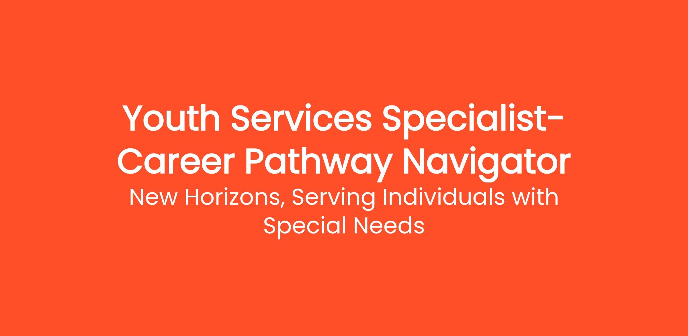 SUMMARY: The Primary role for the Youth Services Specialist- Career Pathway Navigator (YSS-CPN) is to help young people (typically 16-21) develop a Person-Centered Career Plan. You'll support each Member as they transition from school based support to the world of adult IDD services and competitive integrated employment. You might also support New Horizons’ youth program in the schools, creating a welcoming, active and outcome-oriented experience for young adults with disabilities. Supports and serves as back-up for other Youth Services department activities.
